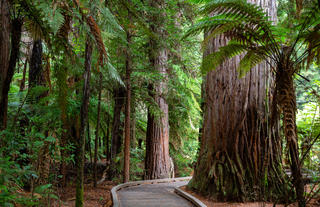 A city where steam rises beside streets and traffic moves within a geothermal basin, Rotorua sits on the southern shore of Lake Rotorua. The town centre runs along the lakefront, with paths, boats, and cafés close to the warm water's edge. The air carries a sharp sulphur scent as geysers burst at Te Puia, a geothermal and cultural complex just outside the centre of Rotorua, sending water several metres into the air. At Wai-O-Tapu, a geothermal park about 25–30 km south of Rotorua, known for its visibly active and chemically coloured landscape, sits within the Taupō Volcanic Zone, where underground heat drives constant surface activity. Walking tracks pass through sections of steaming vents, bubbling mud pools, and collapsed craters, all shaped by mineral deposits over time. Its most recognisable feature is the Champagne Pool, a wide, hot spring edged in bright orange silica, with green water at its centre. Nearby, the Lady Knox Geyser erupts daily at a set time, sending a column of water into the air for several minutes. Adventure activities include white-water rafting on the Kaituna River and mountain biking across 5–35 kilometre trail networks in Whakarewarewa Forest. Māori cultural villages stage haka performances, carving demonstrations, and meals cooked in earth ovens.