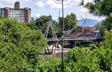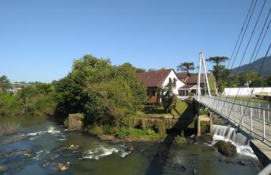 In the Itajaí Valley of southern Brazil, Timbó lies along the Benedito River, where low hills rise into forested slopes and narrow valleys carry rural roads inland. Settlement began in the late 19th century with German and Italian immigrants, seen in timber-framed houses, Lutheran churches, and orderly street grids near the centre. These influences continue in small breweries and bakeries preparing traditional breads and cakes. Cycling paths trace the riverbanks, linking neighbourhoods to Parque Jardim Botânico, where marked trails cross native vegetation and open lawns. Outside town, Freymund Germer Municipal Natural Park occupies Morro Azul, where a paragliding ramp faces across farmland and distant ridges, with camping areas, barbecues, and forest trails where Atlantic fauna appear. Surrounding districts feature waterfalls and clear pools, while central squares host regular markets with regional foods and handmade goods.