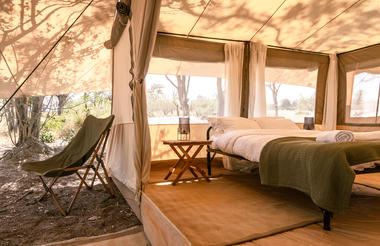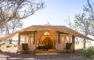 - 3-night Savuti luxury glamping adventure, including all meals, tea/coffee and snacks, beverages (soft drinks, water, beers, selected wines, and selected spirits), activities, and aircraft transfers. Luxury mobile camping amenities include a walk-in shower, bedside lamps, lounge, dining and bar area, private chef, and dedicated guide.