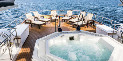 - The sundeck boasts comfortable chaise lounges and spa pool tub, perfect for enjoying the spectacular ocean views as you cruise.