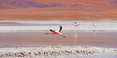 Regularly encountered across the open plains and wetlands and often seen moving freely against dramatic volcanic backdrops.Flamingos (Andean, James’s and Chilean)