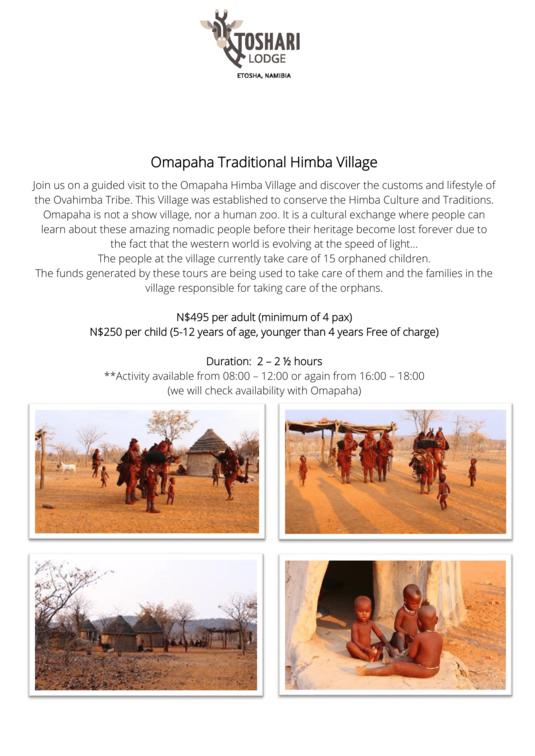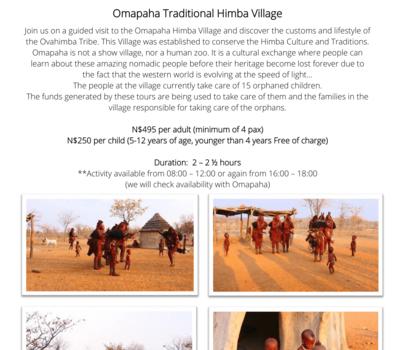 Join us on a guided visit to the Omapaha Himba Village and discover the customs and lifestyle of
