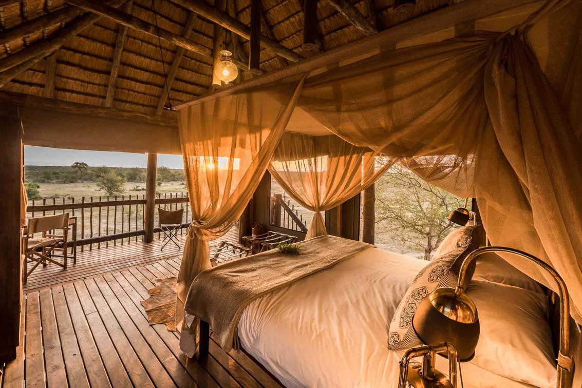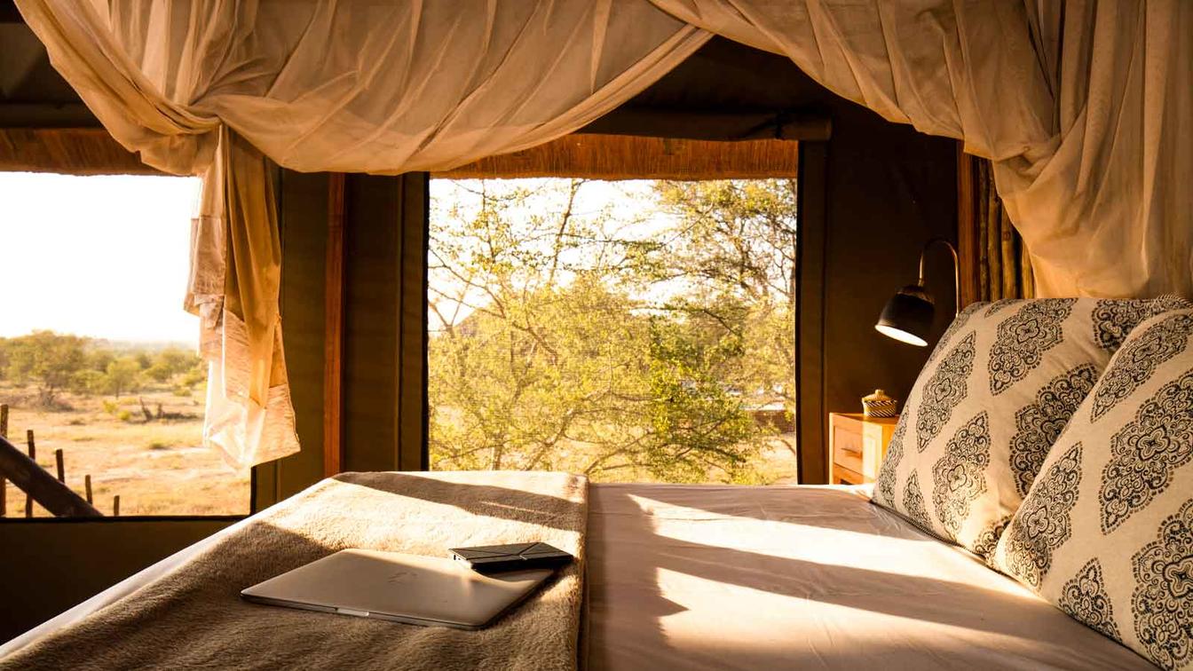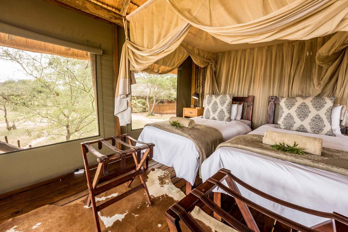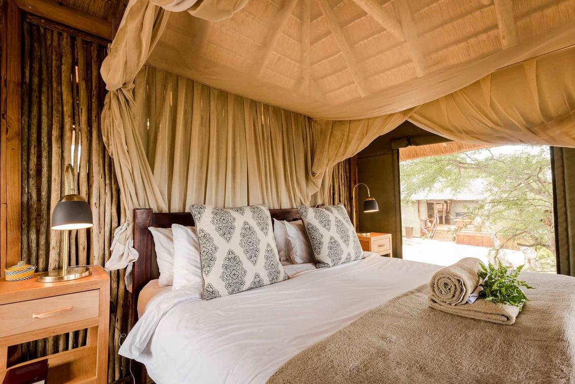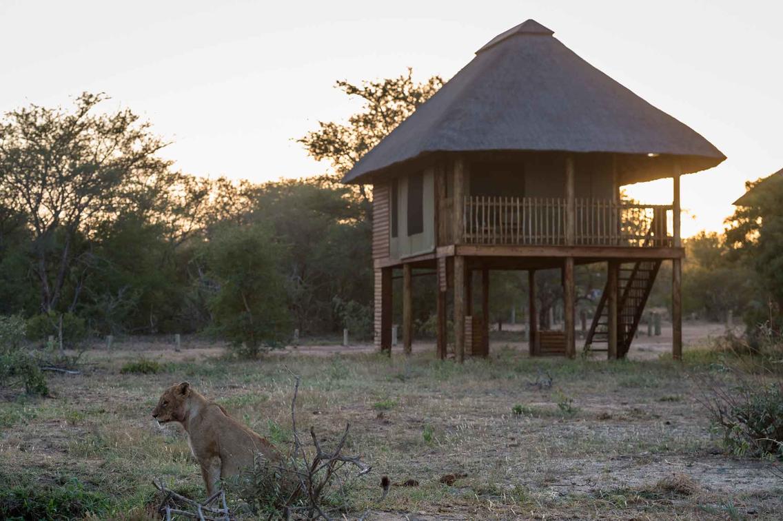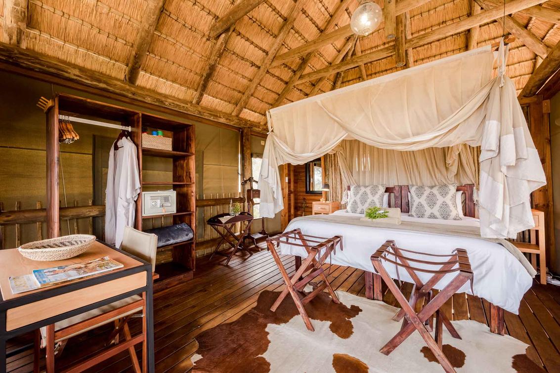 Der er 5 identiske træhushytter på Nthambo Tree Camp, hver hævet på træpæle i øjenhøjde med træerne og med udsigt over det åbne område foran lejren. Stråkt trækonstruktioner med egen balkon, eget badeværelse og komfortable dobbelt- eller tvillingesenge. Der er bagagehylder, myggenet, tøjhylder, pengeskabe og skriveborde i hvert værelse. Der er ingen hegn omkring lejren, så man skal passe på, når man går fra din hytte til hovedlodsområdet og tilbage.