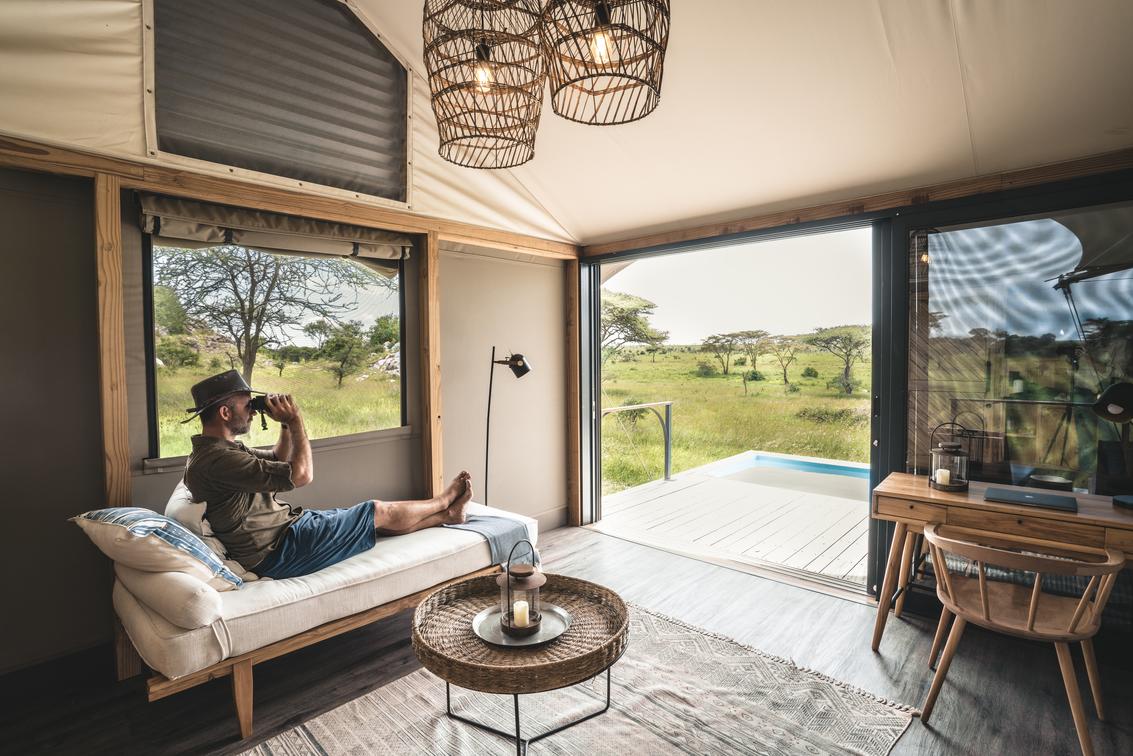 Faciliteterne omfatter en stor seng, rummelig opholdsstue og stort badeværelse med dobbelt håndvask, bruser og fritstående badekar. Det dejlige trædæk har nedsænkede siddepladser, udendørs bruser og fantastisk hjørnebassin med udsigt direkte over Serengeti storslåede græsarealer. Begge soveværelser har eget badeværelse med en gangbro, der forbinder, hvilket gør det til en idé for venner, familier eller grupper, der rejser sammen. Maksimal belægning 6