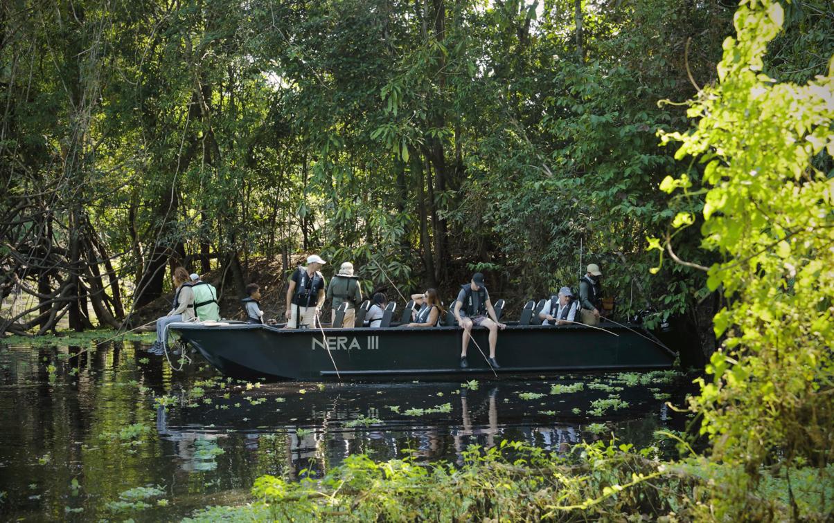 Ausflüge in kleinen Gruppen vom Aqua Nera in den Amazonas-Dschungel zeigen die einzigartige Amazonas-Wildtiere, Vögel und Pflanzen dieses reichen Lebensraums. Aqua Expeditions maßgeschneiderte motorisierte Aluminium-Trägerboote oder Skiffs bringen bis zu zehn Passagiere auf zwei bis drei täglichen Ausflügen tief in die schlängeligen Nebenflüsse Amazoniens auf der Suche nach gepanzerten Wels, rotbauchigen Piranhas und den perlenäugigen Köpfen von Brillenkaimanen im rätselhaften schwarzen Wasser.
