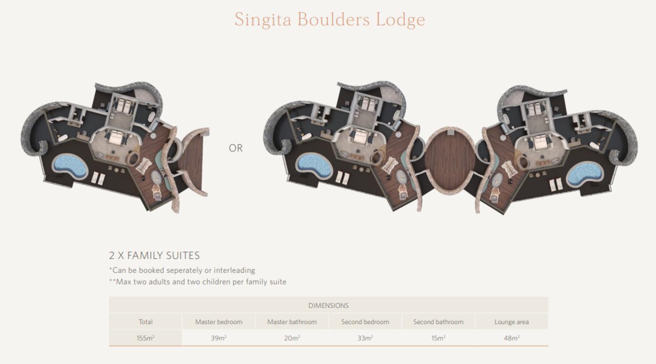 Zwei luxuriöse, klimatisierte Suiten mit zwei Schlafzimmern bestehen aus prächtigen Badezimmern, Innen- und Außenduschen, einem weitläufigen Wohnbereich mit doppelseitigem Kamin, einer Minibar und einem Kühlschrank, privaten Holzfreizeitdecks mit einem privaten beheizten Tauchbecken. Alle Suiten verfügen über Direktwahltelefone, und die Bibliothek verfügt über zwei Computer und direkte Internetverbindungen.