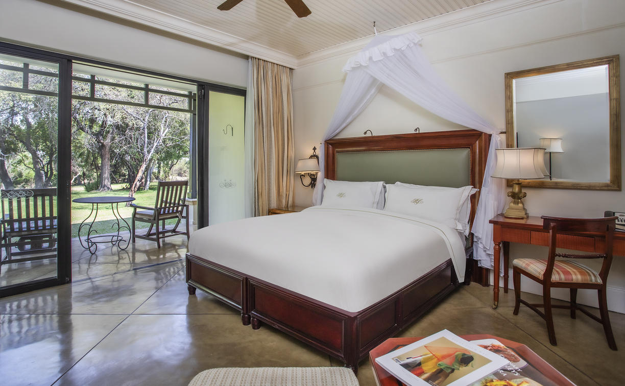 Viktorianische Eleganz passt nur zu den elegantesten Unterkünften der Victoria Falls. Schwelgen Sie in raffiniertem Luxus und genießen Sie vielleicht ein gutes Buch in Ihrem hellen Wintergarten, während der Ventilator über Ihnen wirbelt und Zebras auf dem Rasen direkt vor Ihnen grasen.