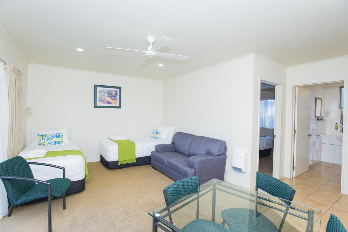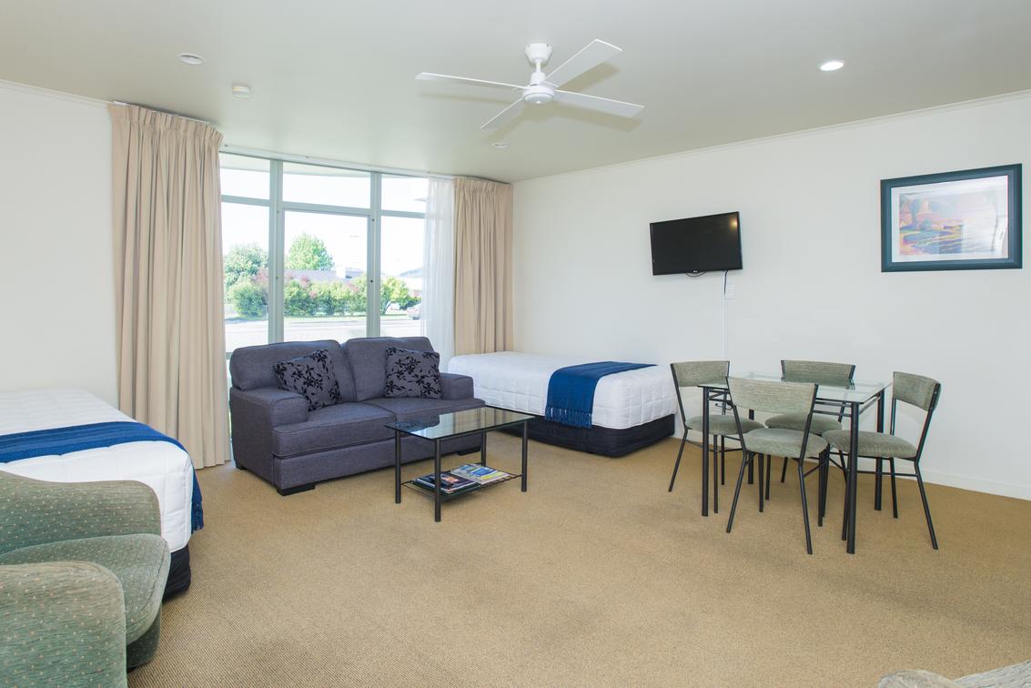Ein Queensize-Bett in 1 Schlafzimmer und 2 Einzelbetten im Wohnzimmer. Großzügige Einheiten. Ideal für Familien oder Sportmannschaften. Ein Flachbild-TV in der Lounge und ein zusätzlicher TV im Hauptschlafzimmer. 8 Sky-Kanäle und 18 Freeview.