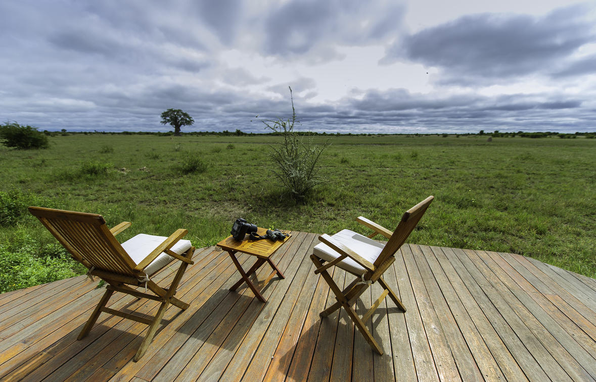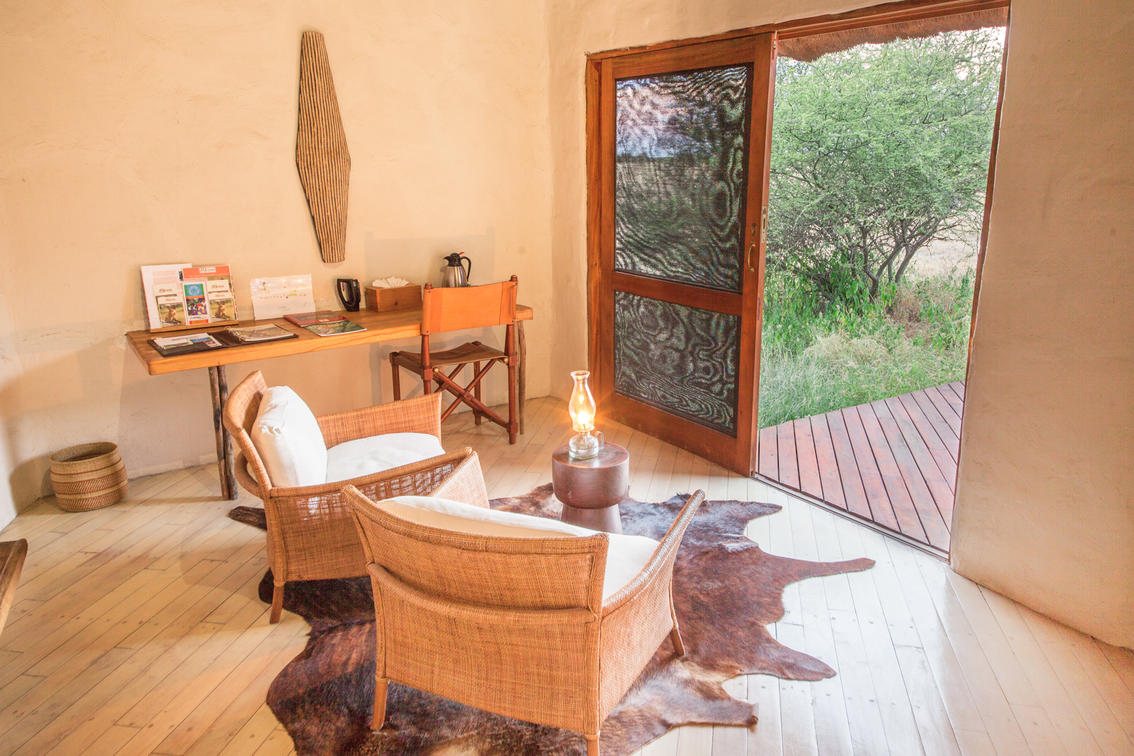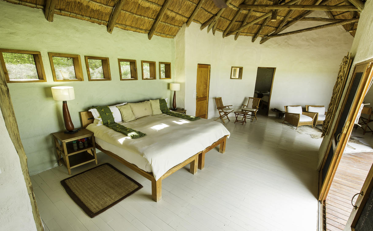 Die Zimmer verfügen über Doppelwaschbecken und Innen- und Außenduschen. Die Zimmer sind geräumig mit Wohnbereich und eines verfügt über ein zusätzliches Zweibettzimmer, ideal für Familien. Alle Einheiten befinden sich auf erhöhten Decks und ihre Lage am Rande des Kamms bedeutet, dass jede Aussichtsplattform eine ganz besondere und faszinierende Aussicht auf die weite offene Pfanne und den großen, schönen Himmel hat. Jede hat eine offene Veranda, die auf das Wasserloch vor dem Lager blickt, wo Elefanten häufige Besucher sind.