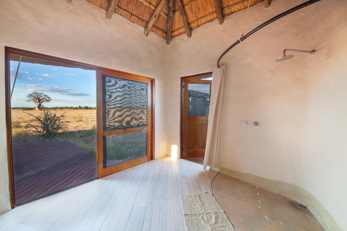 Das minimalistische weiß getünchte Design des Lagers entspricht den umliegenden weißen Salzpfannen. Nxai Pan bietet Platz für bis zu achtzehn Personen in neun umweltfreundlichen Einheiten. Alle sind mit Materialien mit minimaler Umweltbelastung gebaut und halten zusätzlich eine konstante und komfortable Raumtemperatur das ganze Jahr über aufrecht, während die saisonalen Temperaturen von unter dem Gefrierpunkt bis über 40 Grad Celsius variieren.
