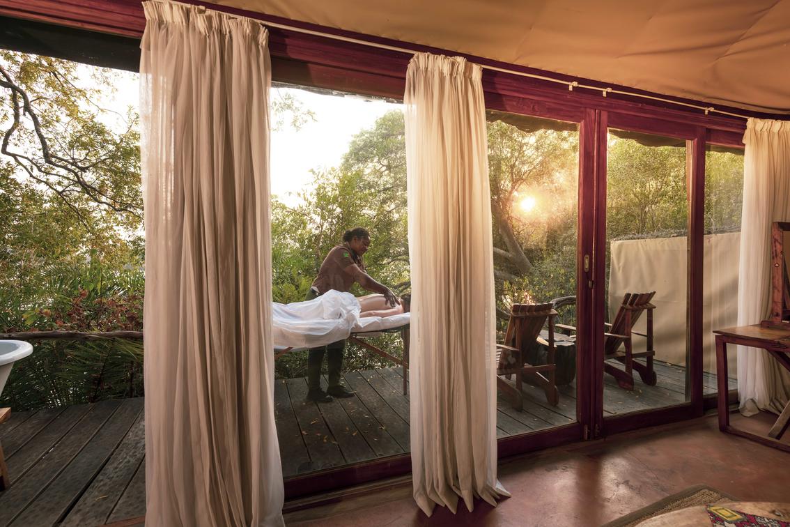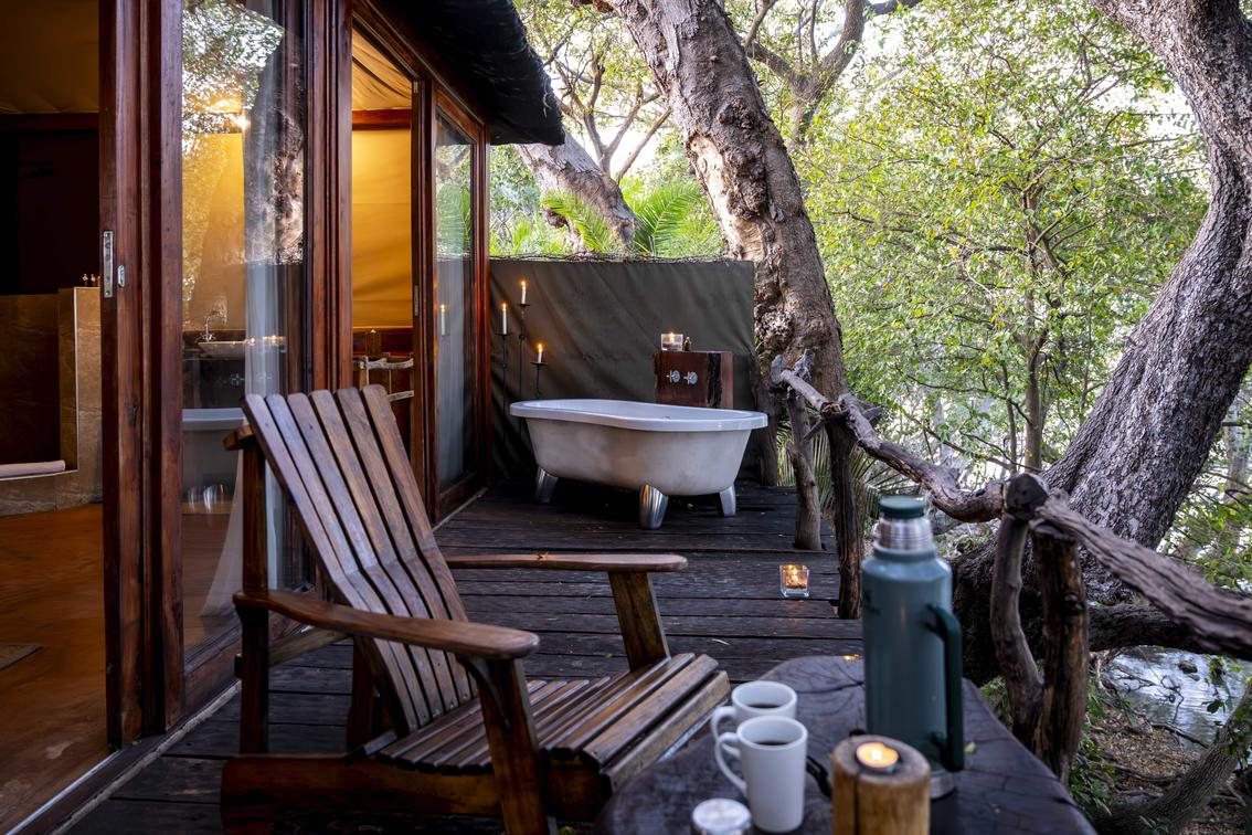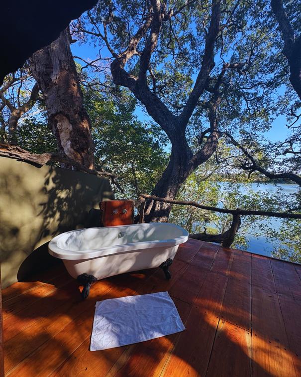 Vier Luxus-Zelte, die über eine private Terrasse mit bequemen Sitzgelegenheiten mit Blick auf den Fluss Kafue verfügen. Dies ist unsere luxuriöseste Unterkunft mit jeder Einheit privat umgeben von natürlichen Flussbusch. Auf jedem Deck befindet sich eine freistehende Kugel- und Klauenbadewanne. Die Möbel sind aus recyceltem Holz von Dhows gefertigt, die früher den Indischen Ozean vor Tansania segeln.