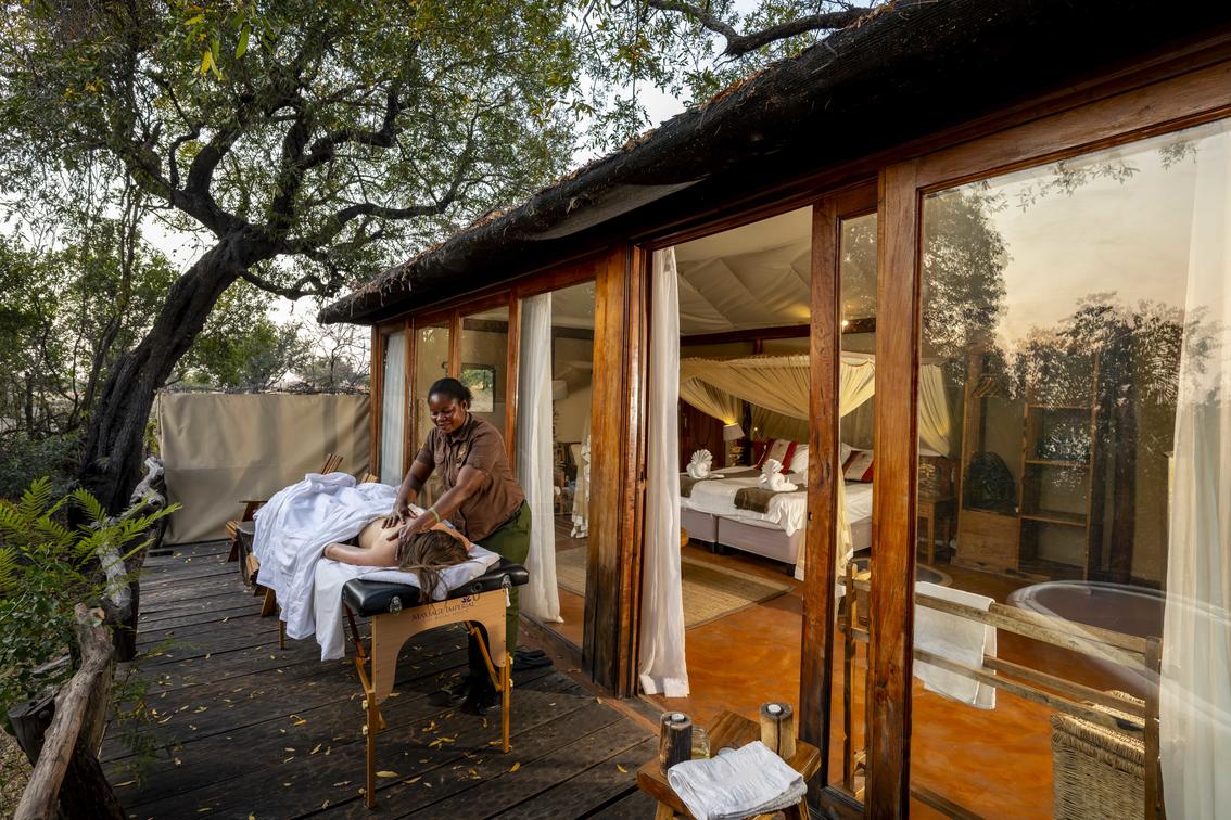 Cocooning Moskitonetze umgeben luxuriöse Boxspringbetten und der Eingang zum privaten Deck besteht aus Wand-zu-Wand hölzernen Glasschiebetüren, die spektakuläre Aussicht und Licht in die Zelte bieten. Die Zelte verfügen über ein offenes Badezimmer mit Dusche, WC und Waschbecken.