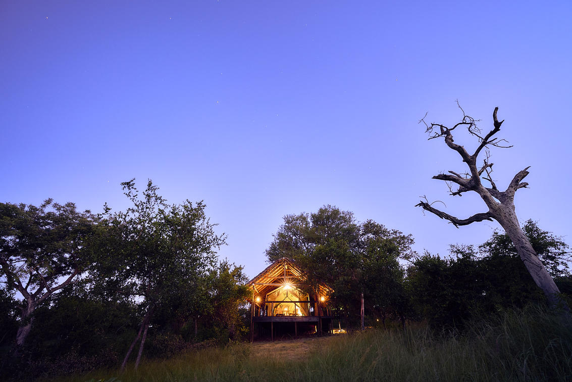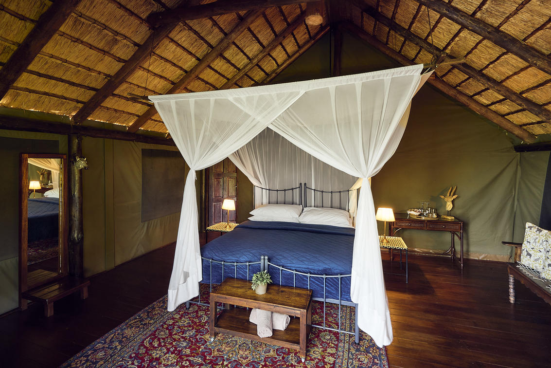 Das klassische Zelt Guineafowl bietet den besten Blick auf das Wasserloch, wo Tiere oft zum Trinken kommen. Es verfügt über ein eigenes Badezimmer mit einer Dusche und einer Aussichtsplattform.