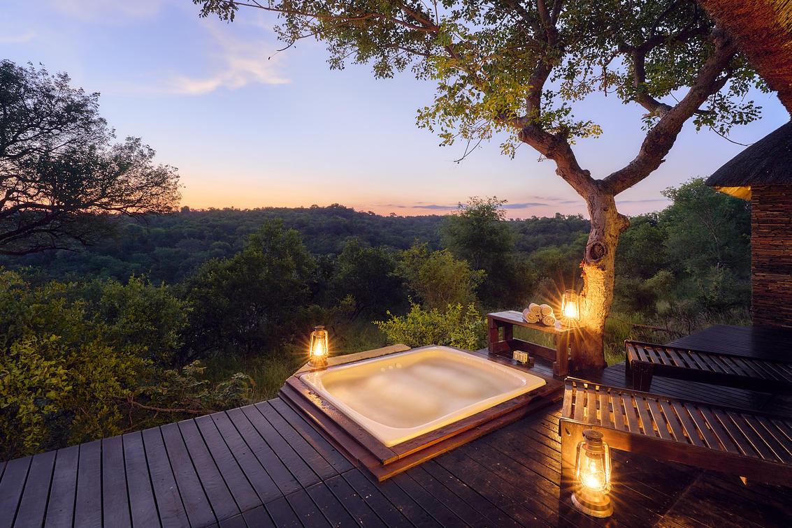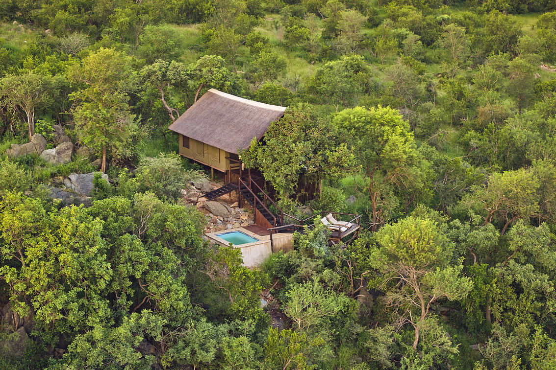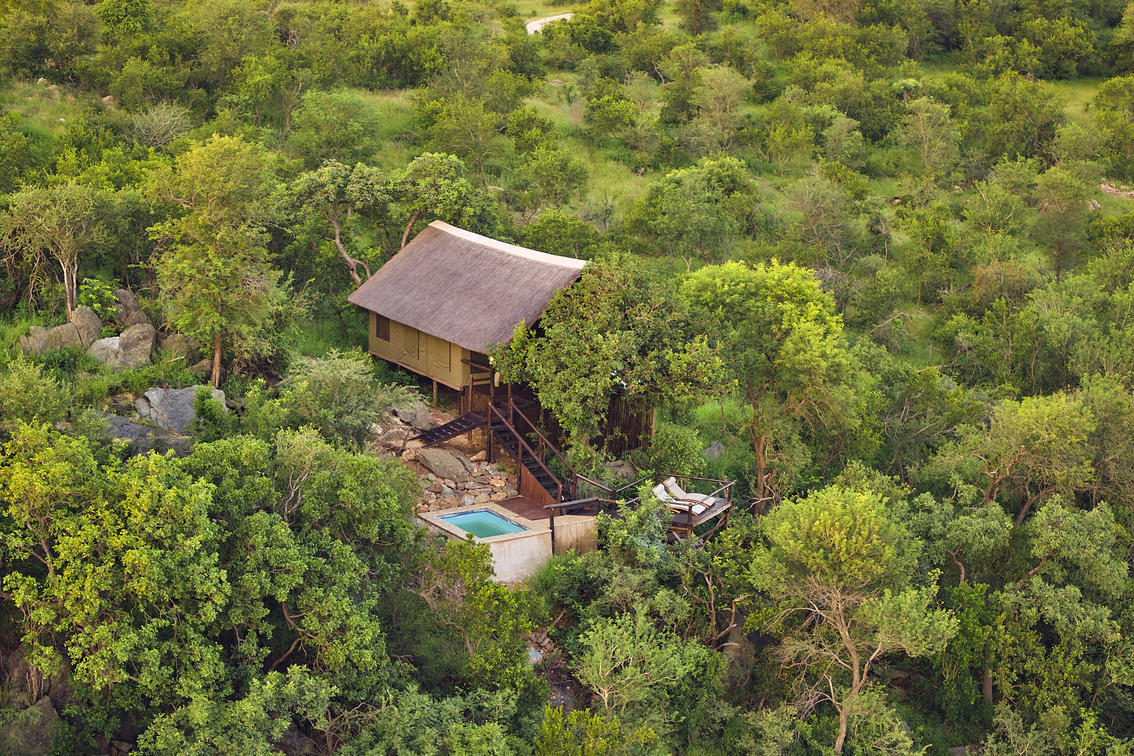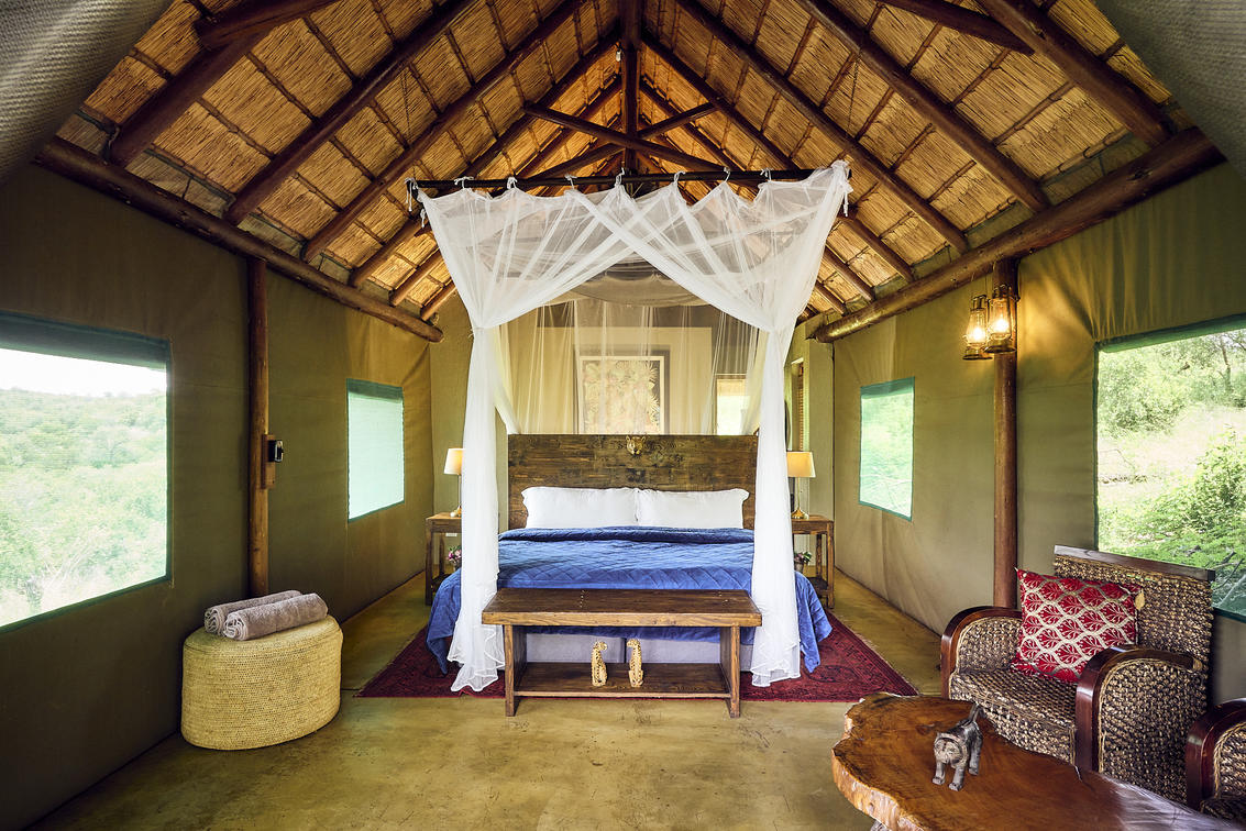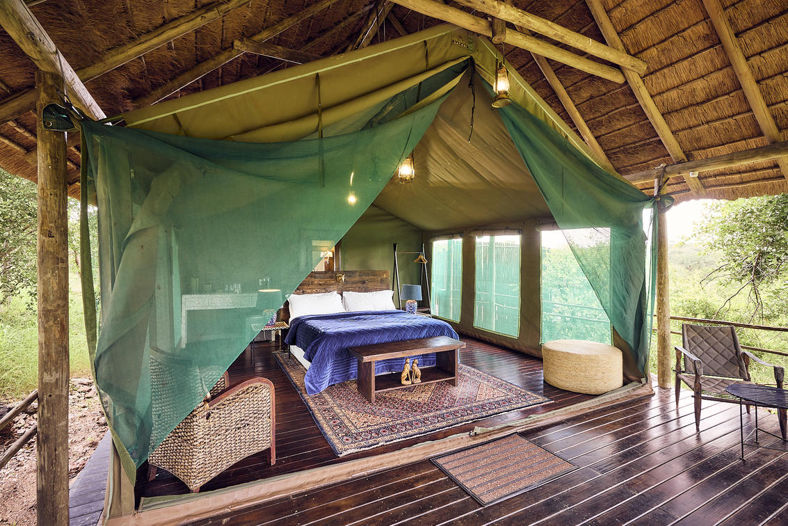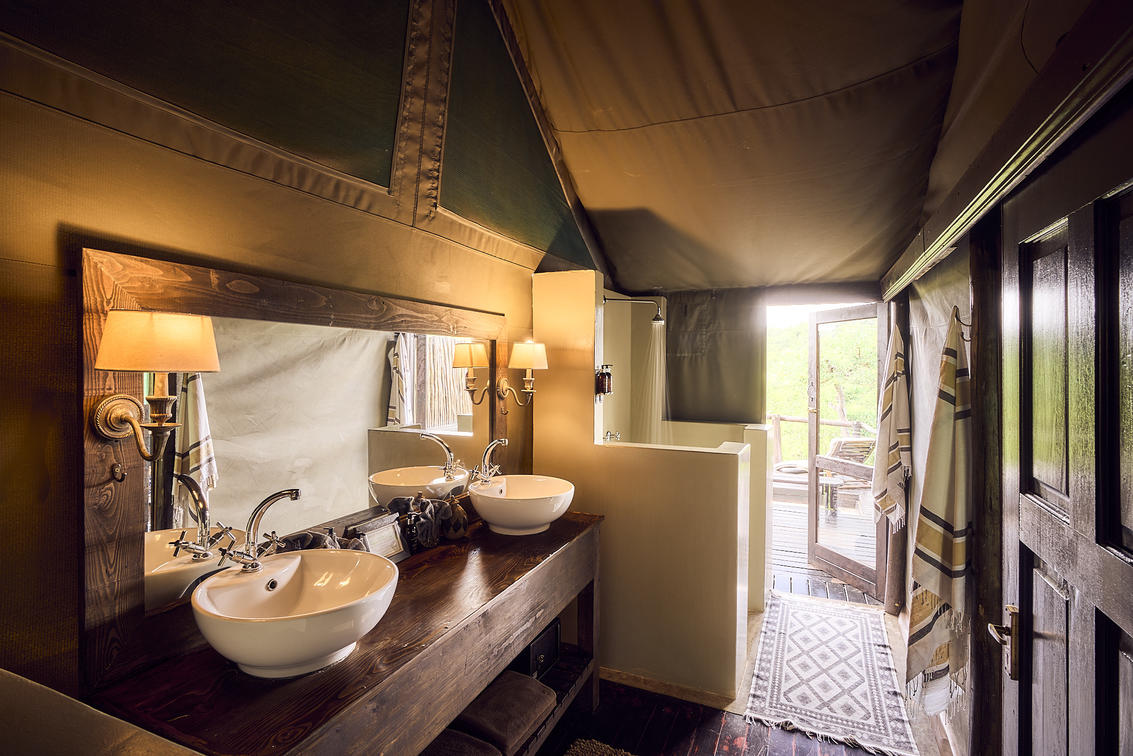 Das luxuriöse Safarizelt befindet sich in absoluter Privatsphäre und verfügt über eine private Aussichtsplattform mit herrlichem Blick auf das Wasserloch und die Berge. Es bietet ein eigenes Bad und eine private Sitzecke.