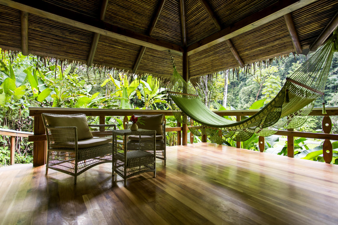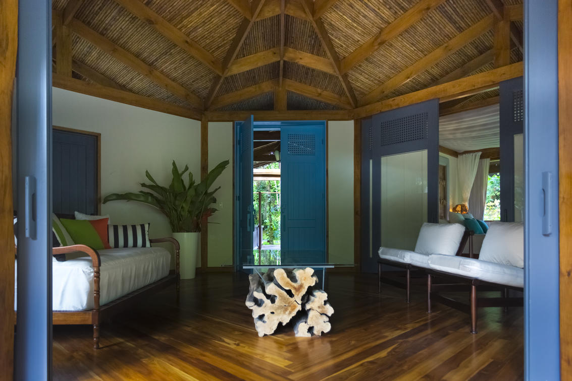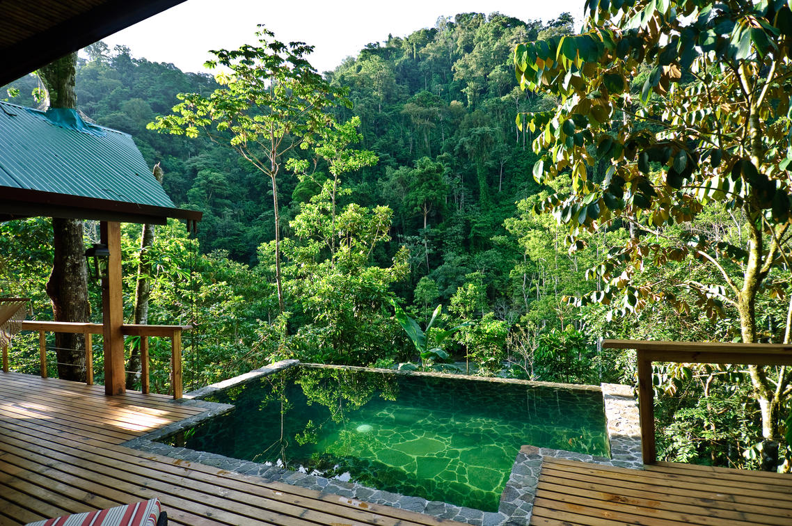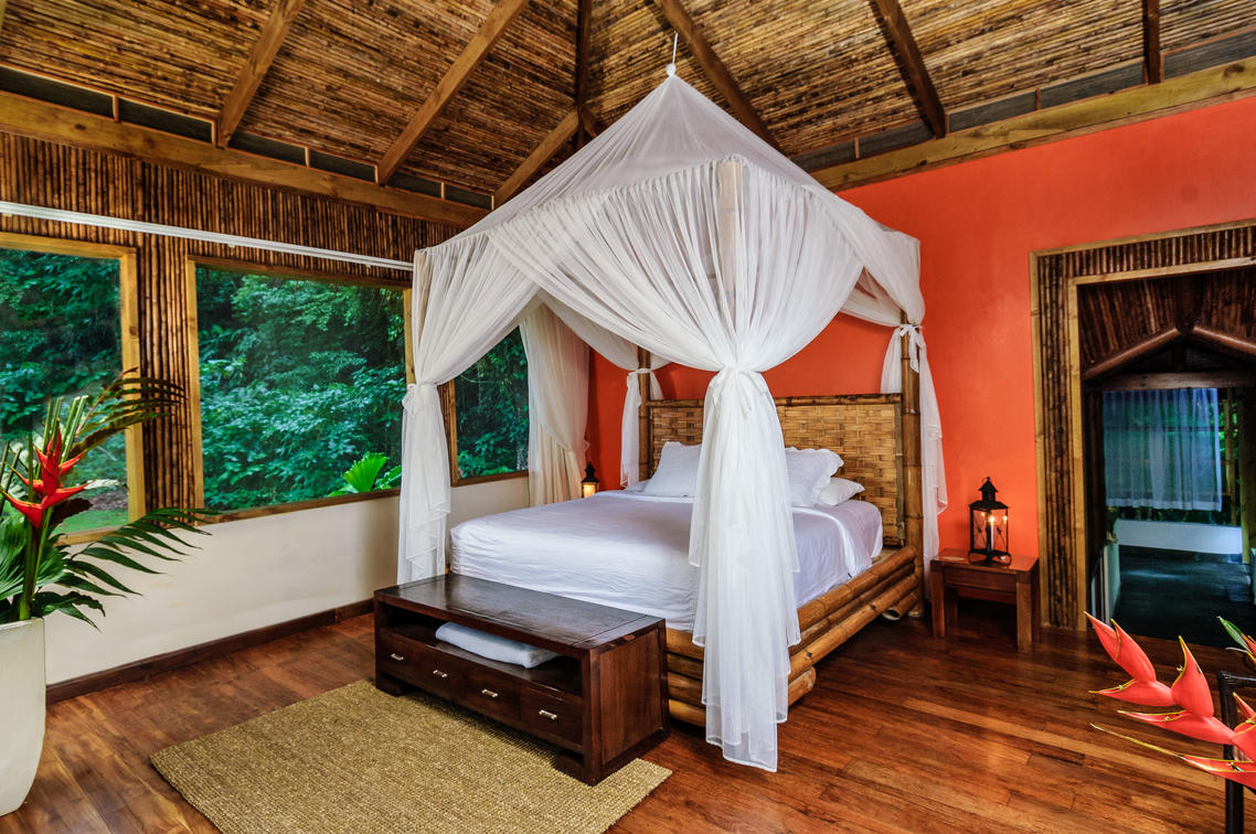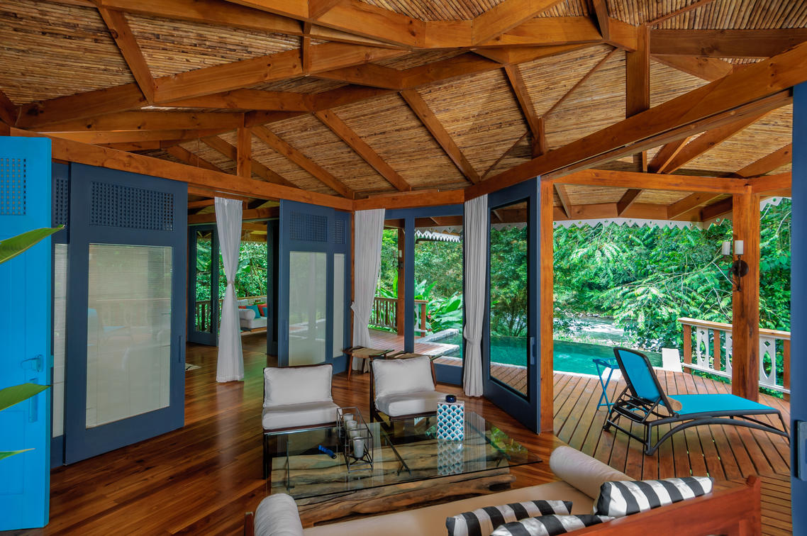 Diese Villa hat ein hohes Dach, Teakholzböden und breite abgeschirmte Fenster, die die Brise durchlassen und einen 360-Grad-Blick auf den Regenwald bieten. Es ist elegant eingerichtet und verfügt über ein Kingsize-Himmelbett. Die angrenzende überdachte Terrasse verfügt über eine Hängematte und einen Sitzbereich. Die gesamte Suite führt auf eine Sonnenterrasse mit einem kleinen Steinpool, der mit Quellwasser gespeist wird.