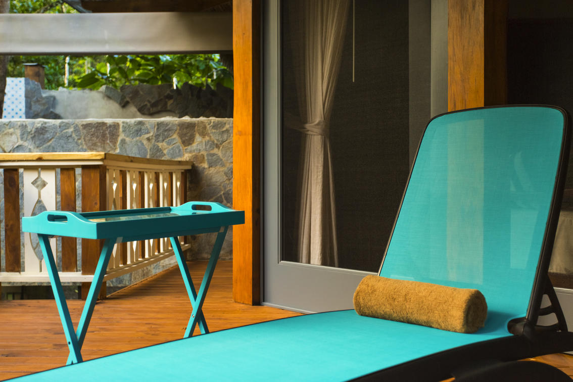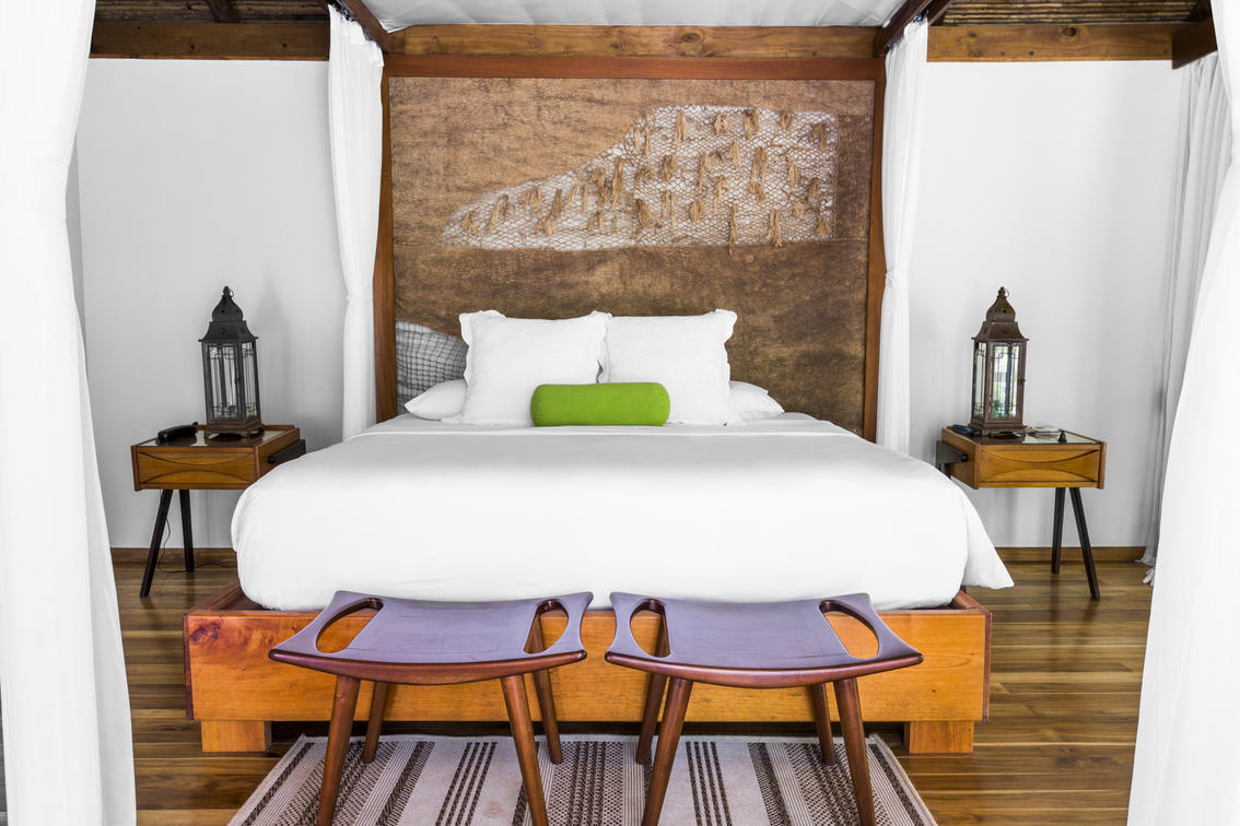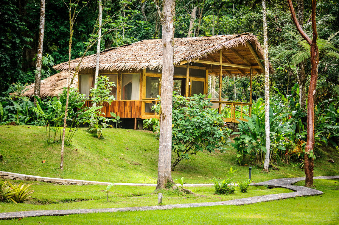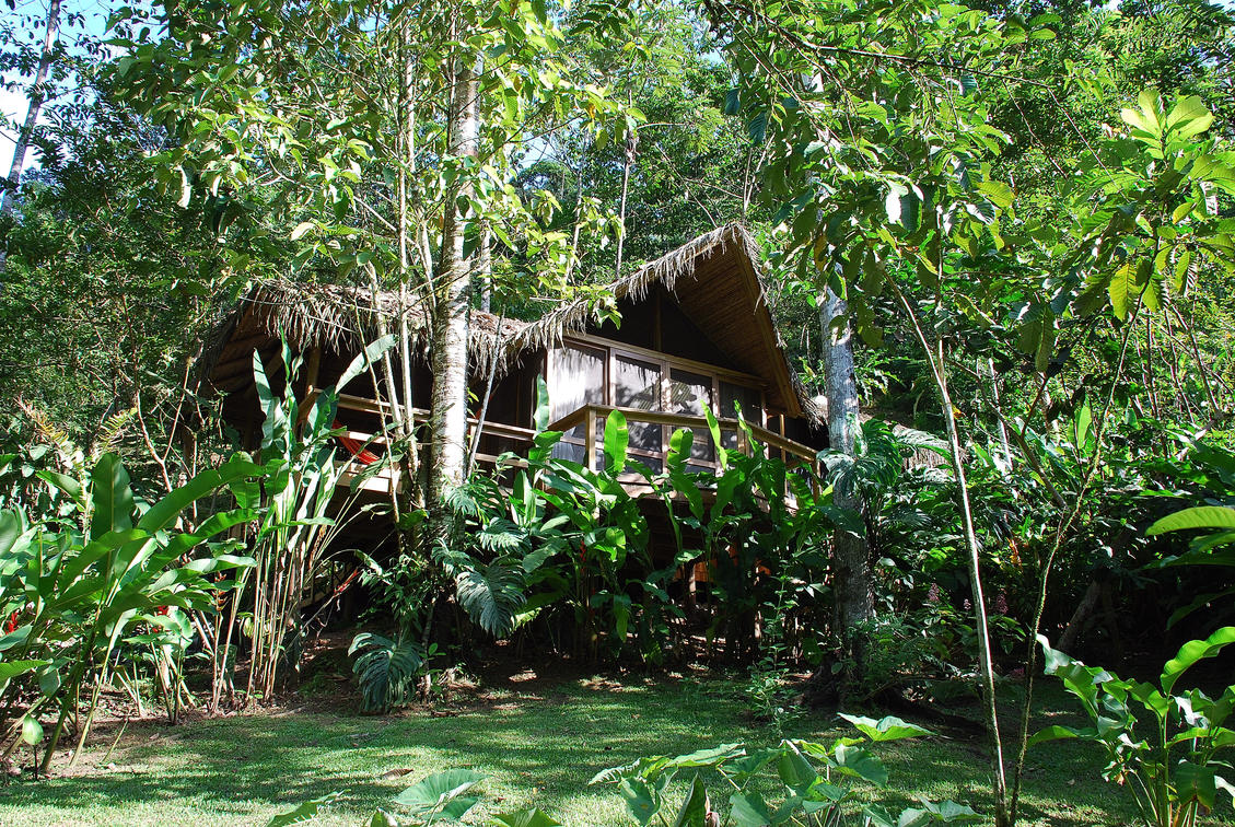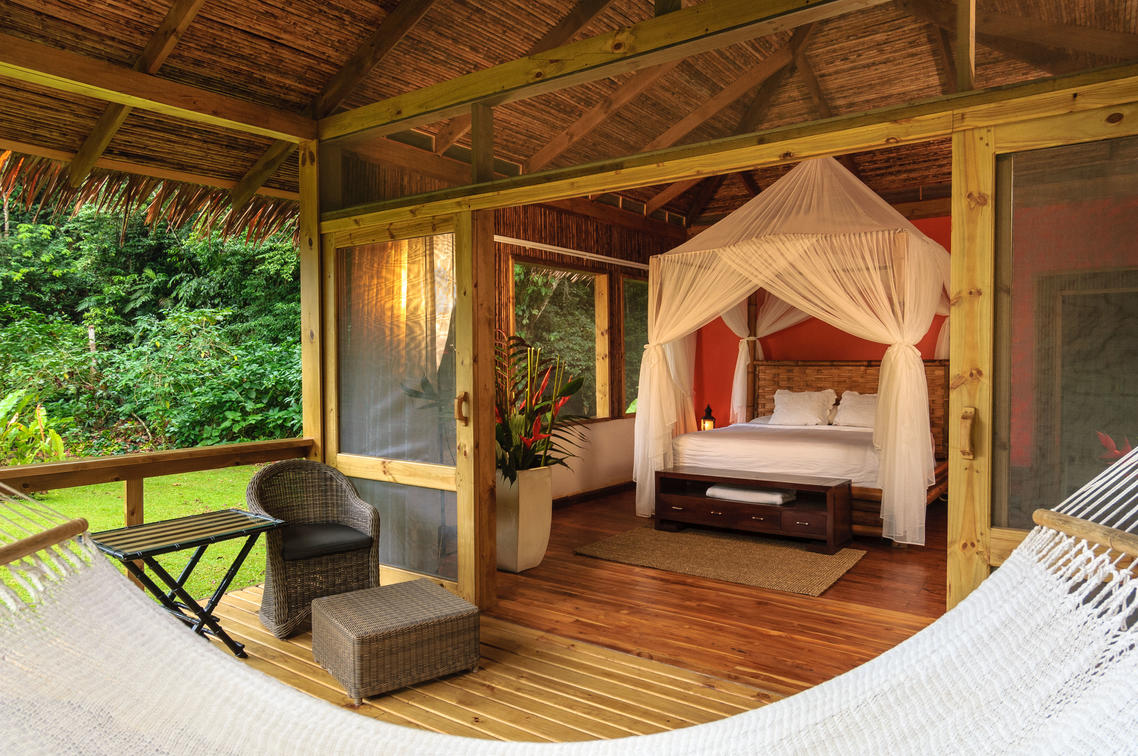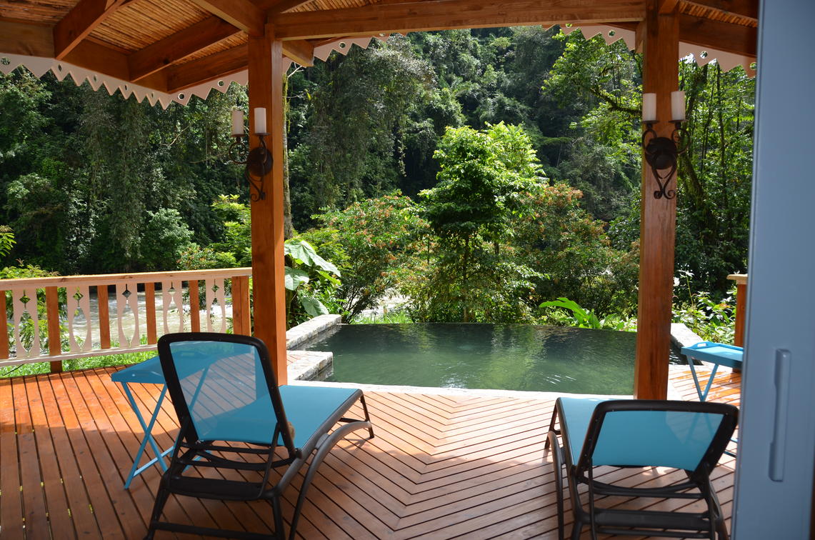 Diese Villa hat ein hohes Dach, Teakholzböden und breite abgeschirmte Fenster, die die Brise durchlassen und einen 360-Grad-Blick auf den Regenwald bieten. Es ist elegant eingerichtet und verfügt über ein Kingsize-Himmelbett. Die angrenzende überdachte Terrasse verfügt über eine Hängematte und einen Sitzbereich. Die gesamte Suite führt auf eine Sonnenterrasse mit einem kleinen Steinpool, der mit Quellwasser gespeist wird.