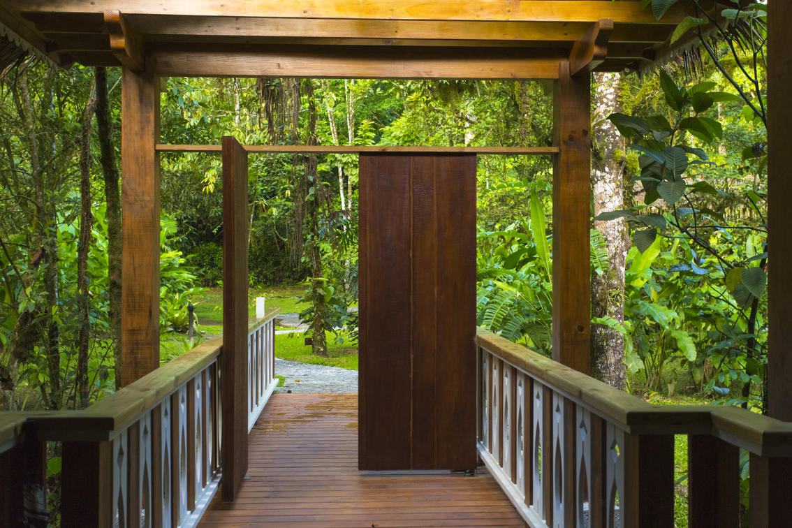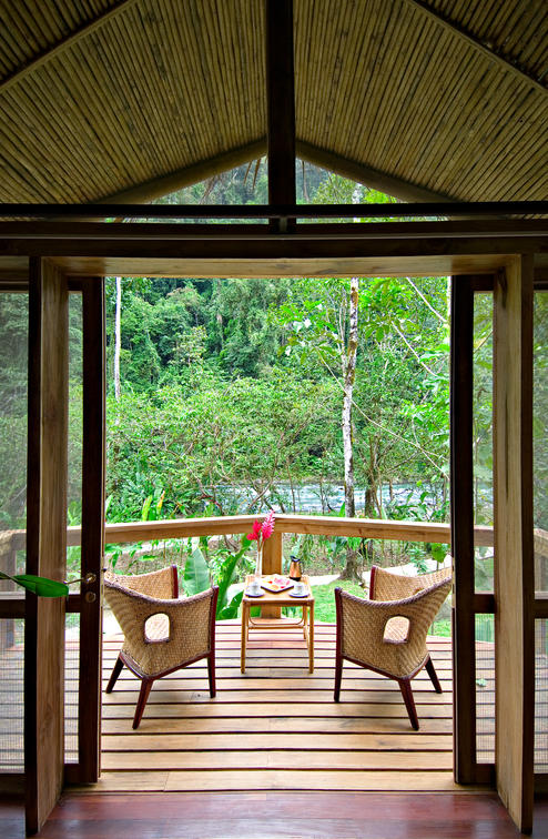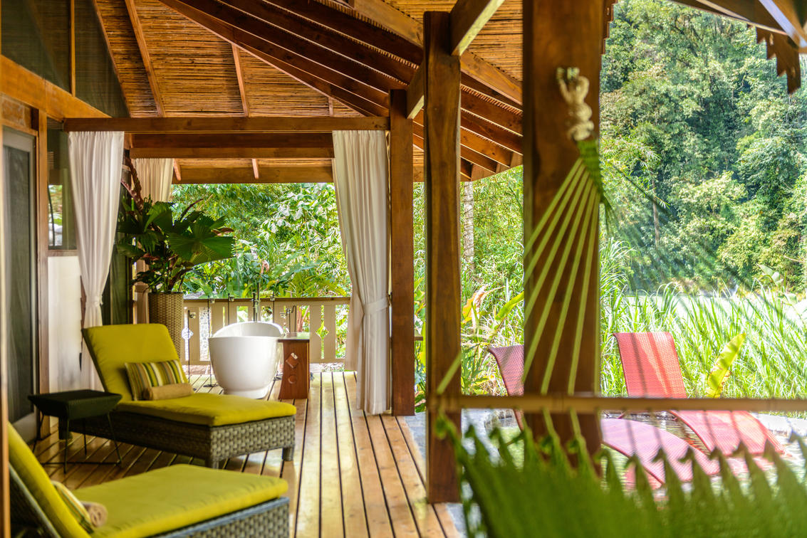Die Gartensuiten verfügen über eine private Terrasse, die zu angelegten einheimischen Buschgärten führt und einen atemberaubenden Blick auf eine riesige Mauer aus dichtem Regenwald bietet, die einen Berghang gegenüber dem Fluss Pacuare hinunterstürzt.
