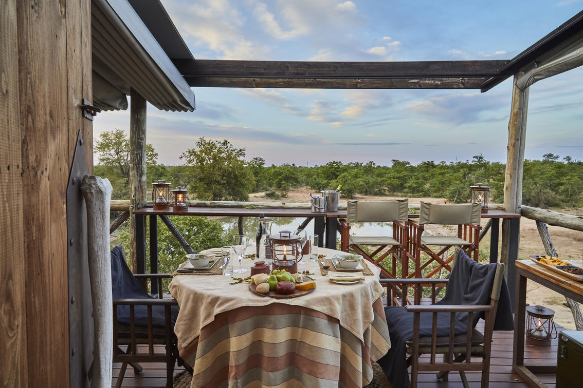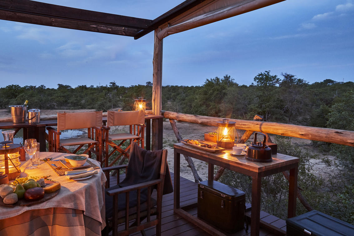 Giraffe's Nest Hide ist ein exklusives und privates Buscherlebnis über Nacht mit Blick auf den Xanatsi-Damm. Das Fell schläft