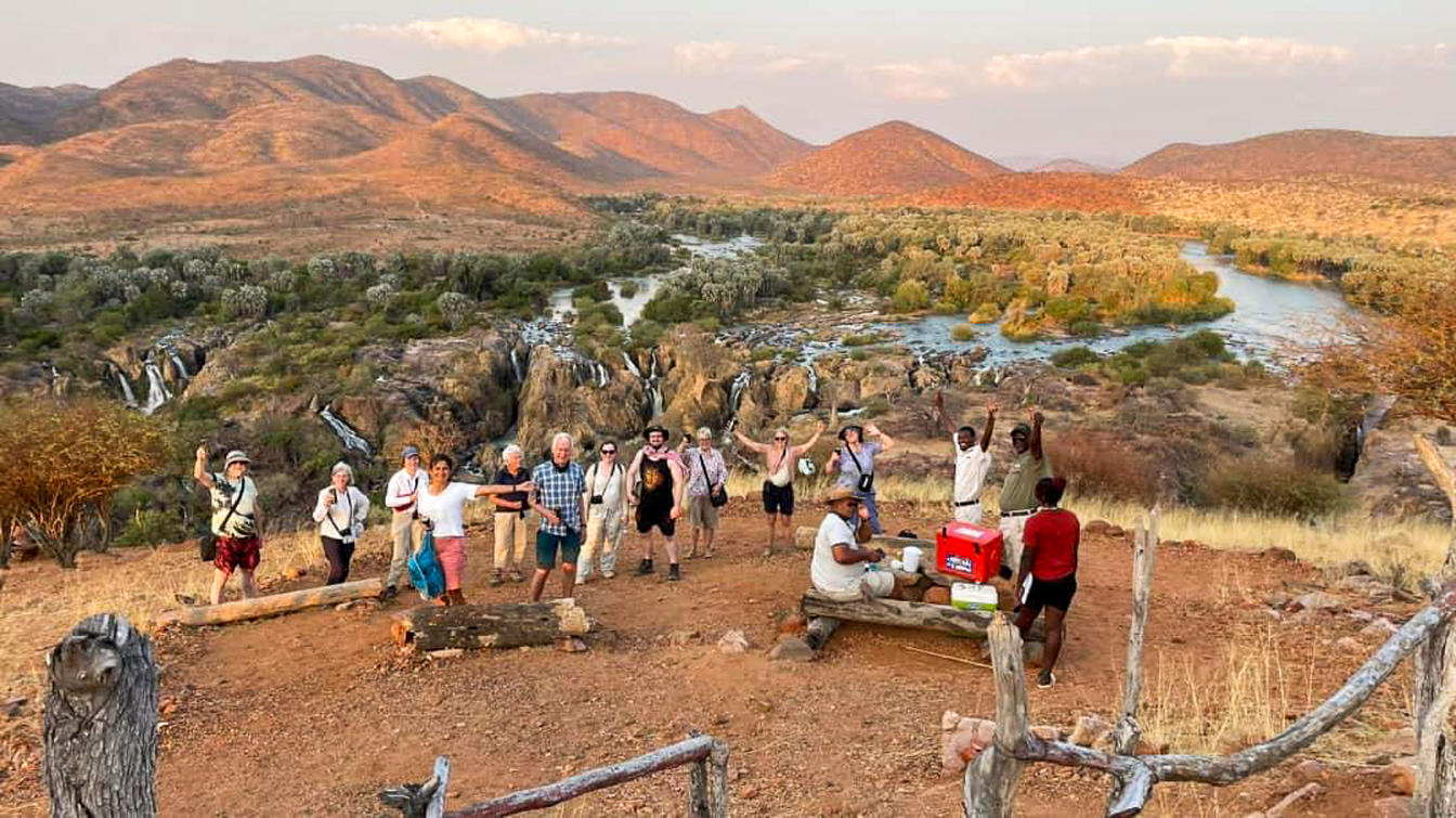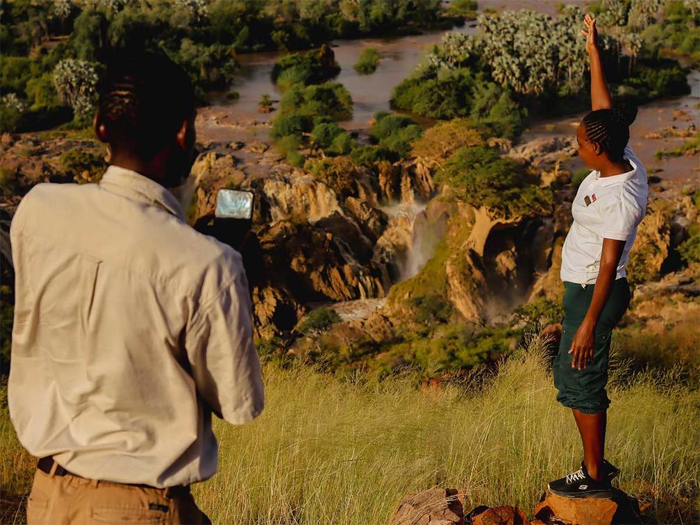 Bevor Sie den Sundowner-Spot erreichen, besteht oft die Möglichkeit, einen kurzen Spaziergang in der Nähe der Wasserfälle zu unternehmen, sodass Sie das rauschende Wasser und die umliegende Landschaft aus nächster Nähe erleben können. Der Kunene-Fluss stürzt über eine Reihe von Kaskaden, die sich über etwa 1,5 km erstrecken und in Angola als Monte Negro-Wasserfälle bekannt sind, etwa 40 Meter in die Tiefe.