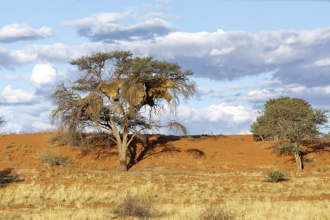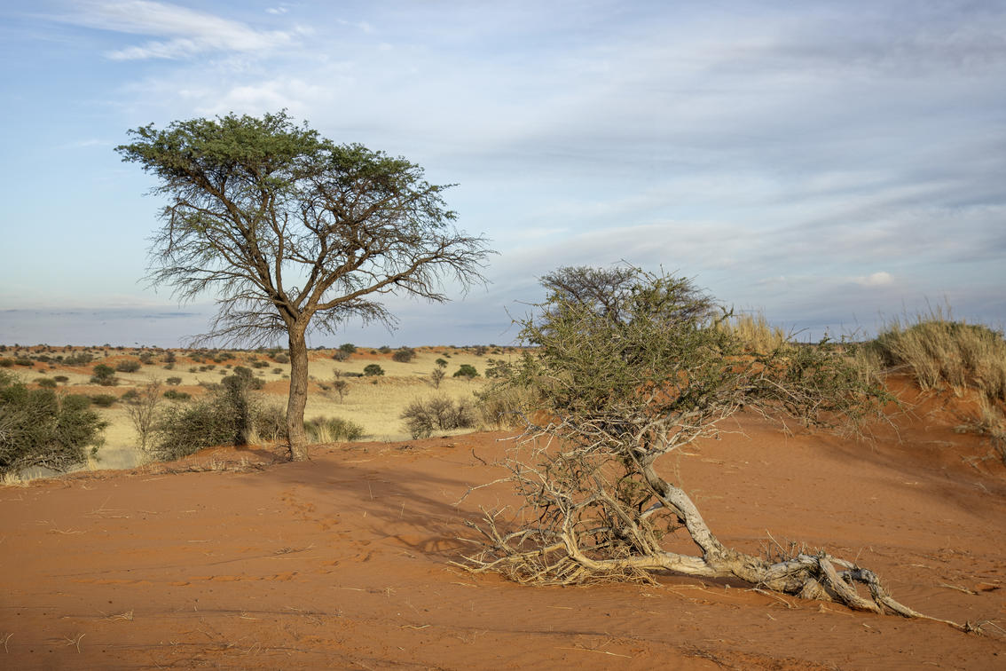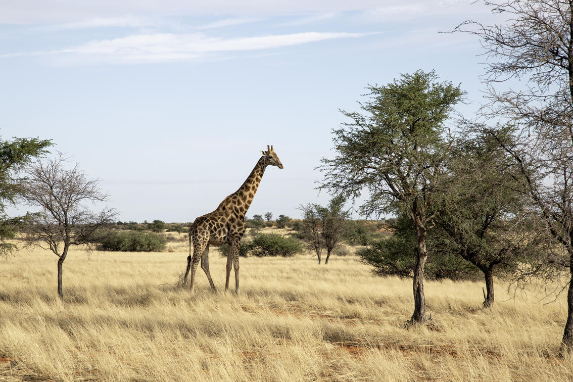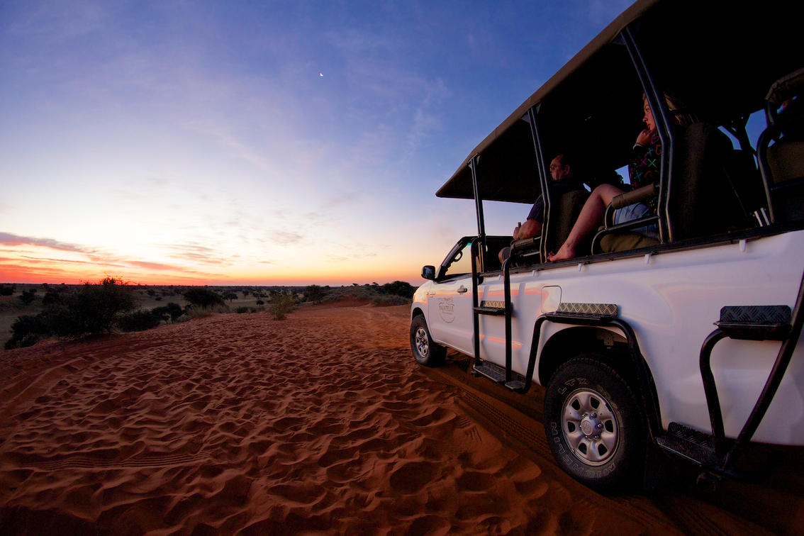 Im riesigen Schutzgebiet findet man mit etwas Glück Giraffen, Kudus, Zebra, Gemsböcke, Gnus, Eland und viele andere Tiere. Einige der höchsten Dünen liegen in dieser Region, von denen aus sich herrliche Ausblicke eröffnen, ganz typisch für die Kalahari. Zwischen den Dünen liegen Ebenen, gespickt mit Akazien. Über 150 Vogelarten leben in der Kalahari. Auch wenn sie sehr schüchtern sind, hat man vielleicht Glück und kann Erdmännchen beobachten. Neigt sich der Tag dem Ende zu, ist es Zeit für den Sonnenuntergang. Den betrachtet man am besten von einer Düne aus, dabei ein erfrischendes Getränk in der Hand.