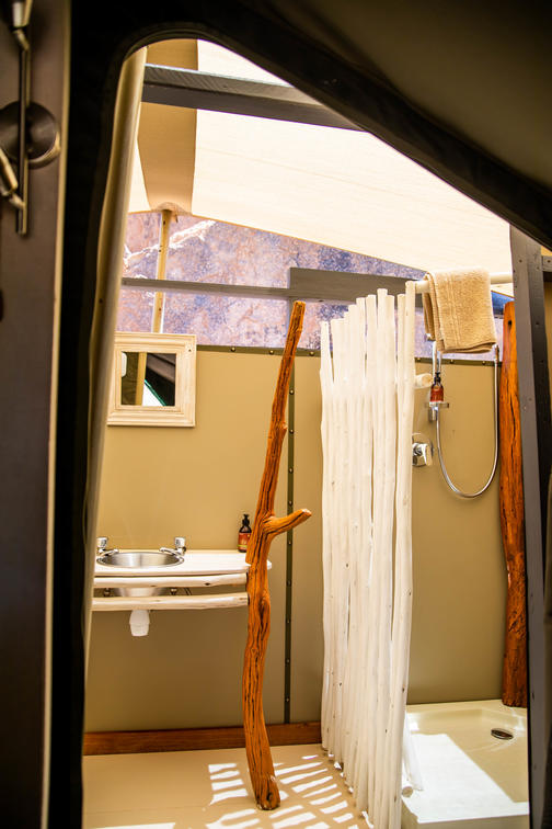 Das Camp besteht aus 12 möblierten Standard Zelten mit zwei Betten (Zweibettzimmer), einem offenen Badezimmer mit Dusche (warmes und kaltes Wasser), Waschbecken und Toilette sowie einer schattigen Terrasse mit Sesseln
