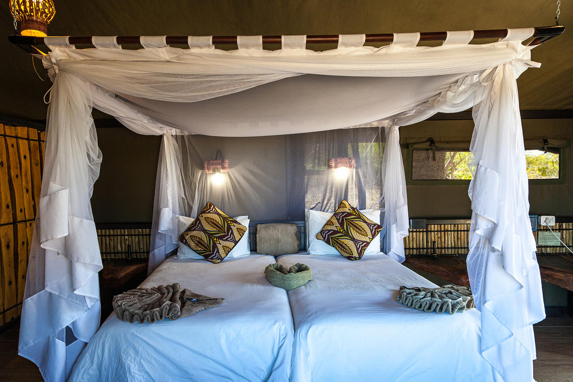 1 feststehendes Honeymoon-Doppelzelt mit Nachttischlampe, Badezimmer, Tee- und Kaffeekocher, heissem Wasser (solarbetrieben) und Kühlbox. Ein erstklassiges, persönliches und umweltbewusstes Safarierlebnis. Die komfortablen Zelte sind durchschnittlich 32 qm gross, von der eigenen Terrasse hat man herrliche Ausblicke in die Natur. Maximal 2 Personen.