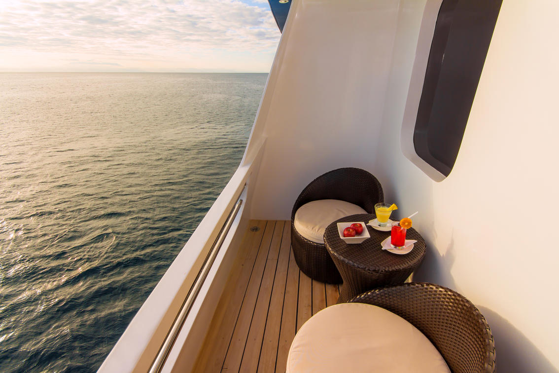 Die Suiten auf dem Oberdeck sind in Konfigurationen mit zwei Einzelbetten oder Doppelbetten erhältlich. Jede der komfortablen Kabinen verfügt über einen eigenen Balkon und bietet Annehmlichkeiten wie Klimaanlage, Warmwasser und ein eigenes Bad. Ihre Größe beträgt 226 ft²/ 21 m².
