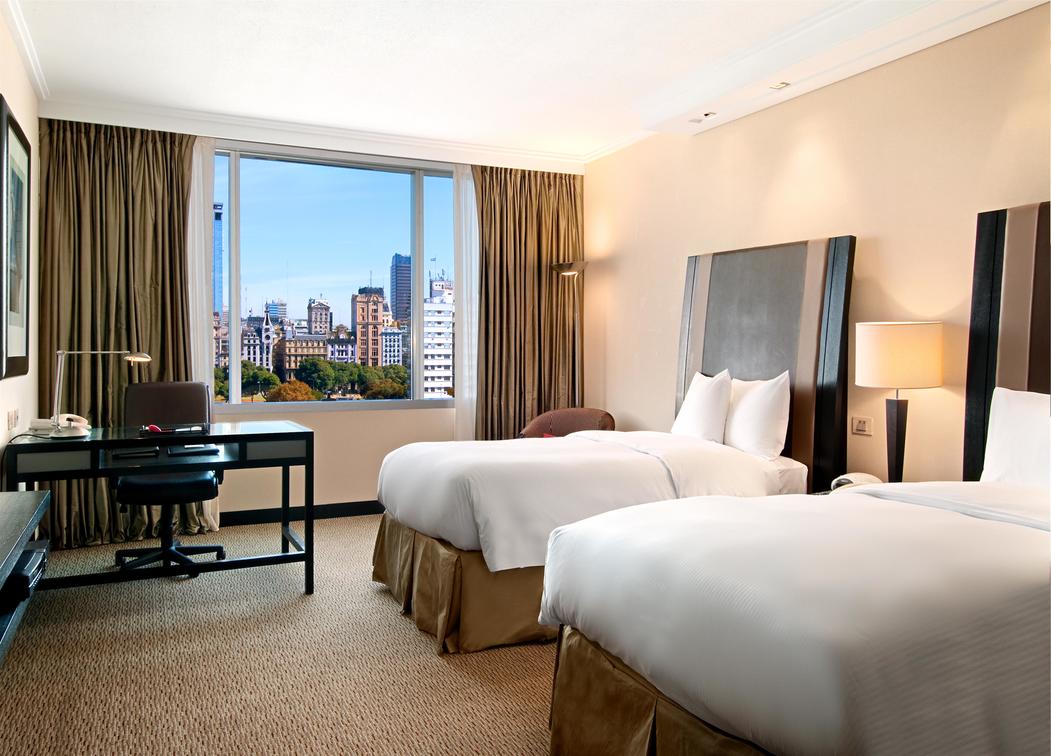 Genießen Sie 2 Einzelbetten, darunter einen Arbeitsbereich, einen TV und einen elektronischen Safe für Ihren Laptop.