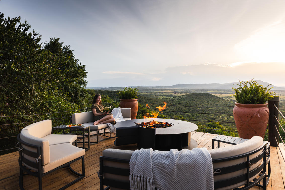 Viewing deck and fireplace at Cottar's Bush Villa