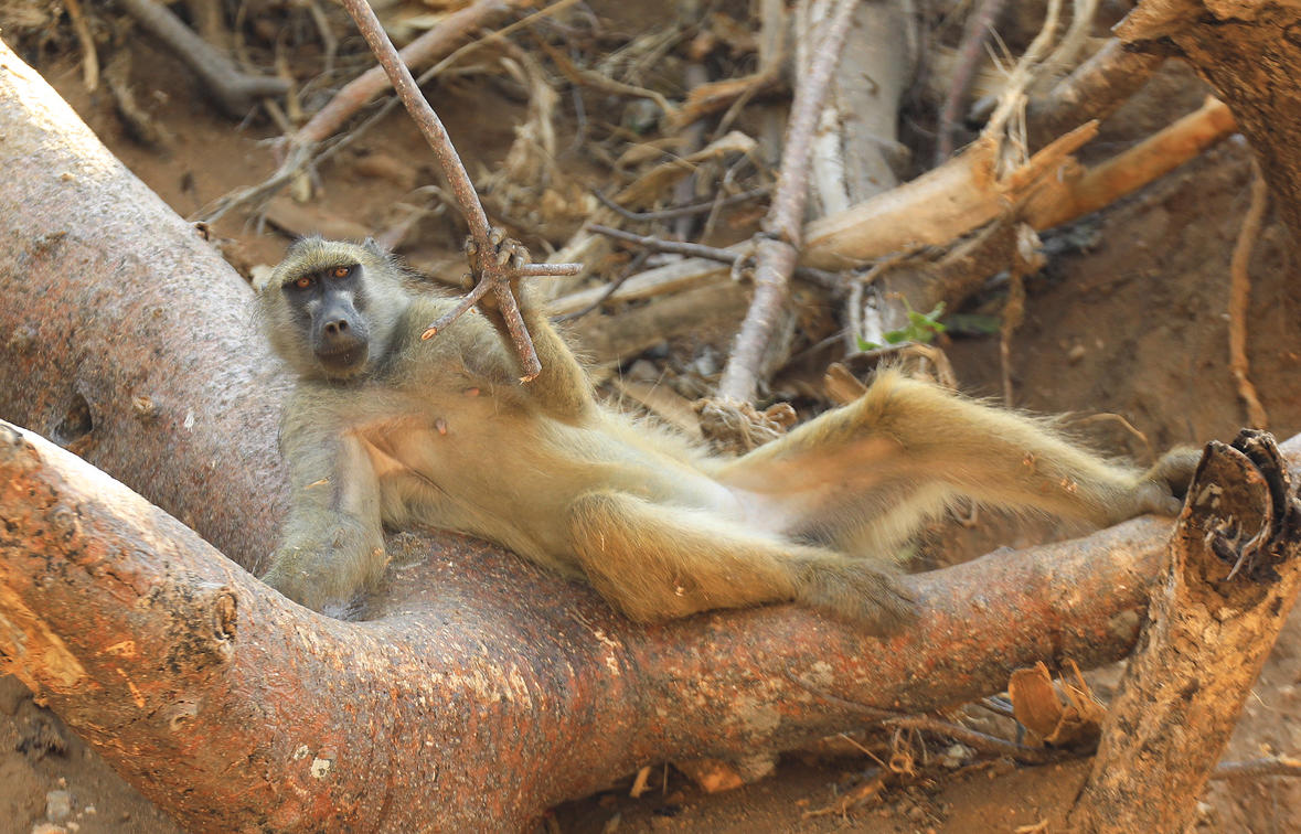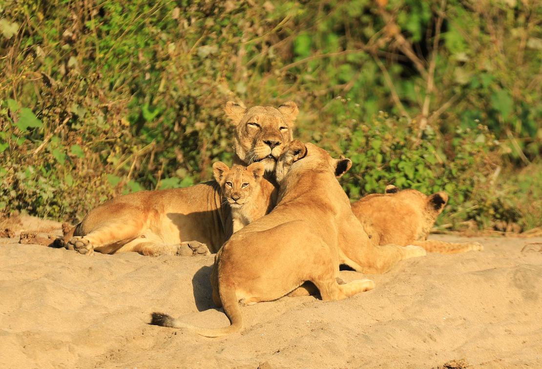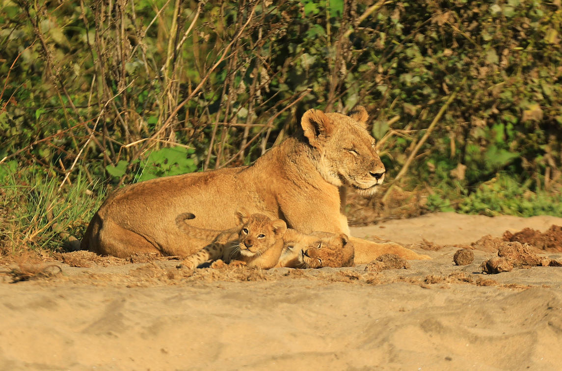 Eine Löwin entspannt auf dem Weg zum Gameviewer