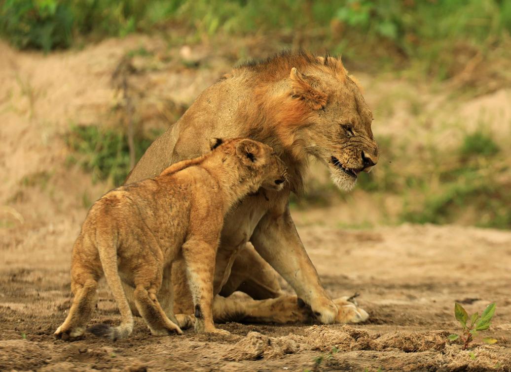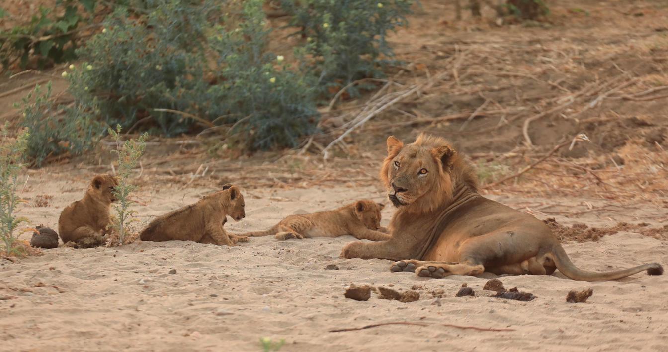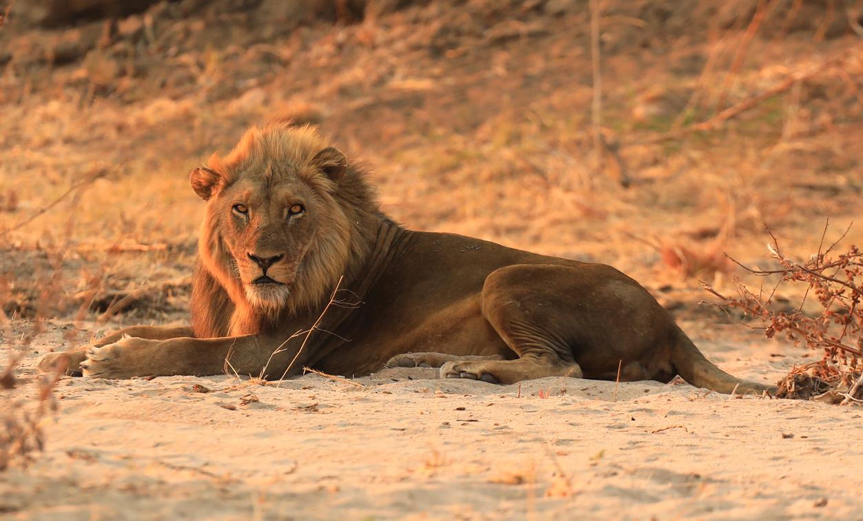 Ein wunderschöner Besuch männlicher Löwe ruht im Flussbett
