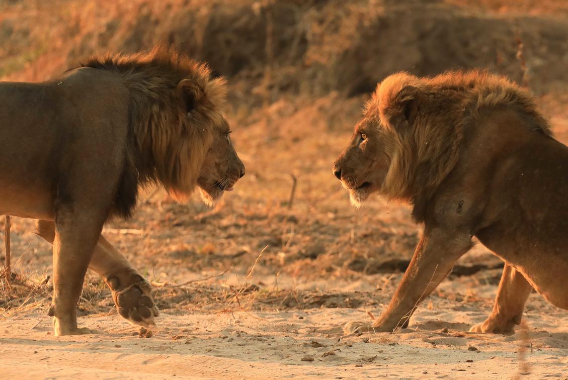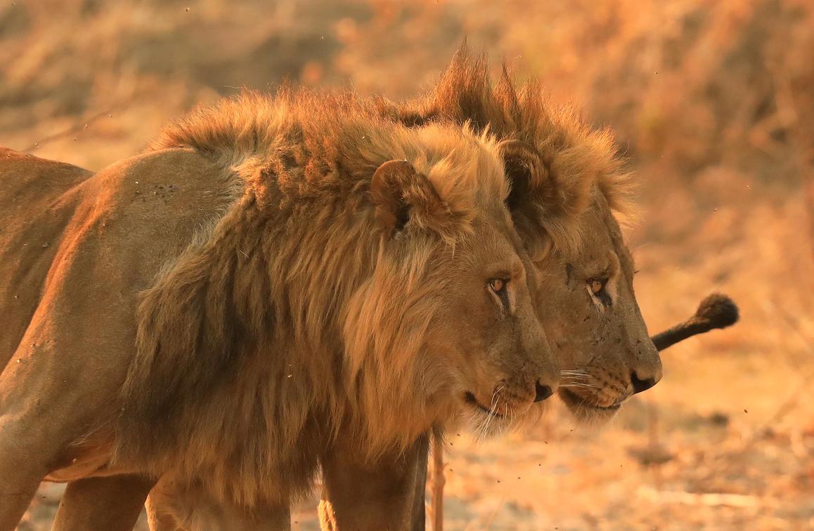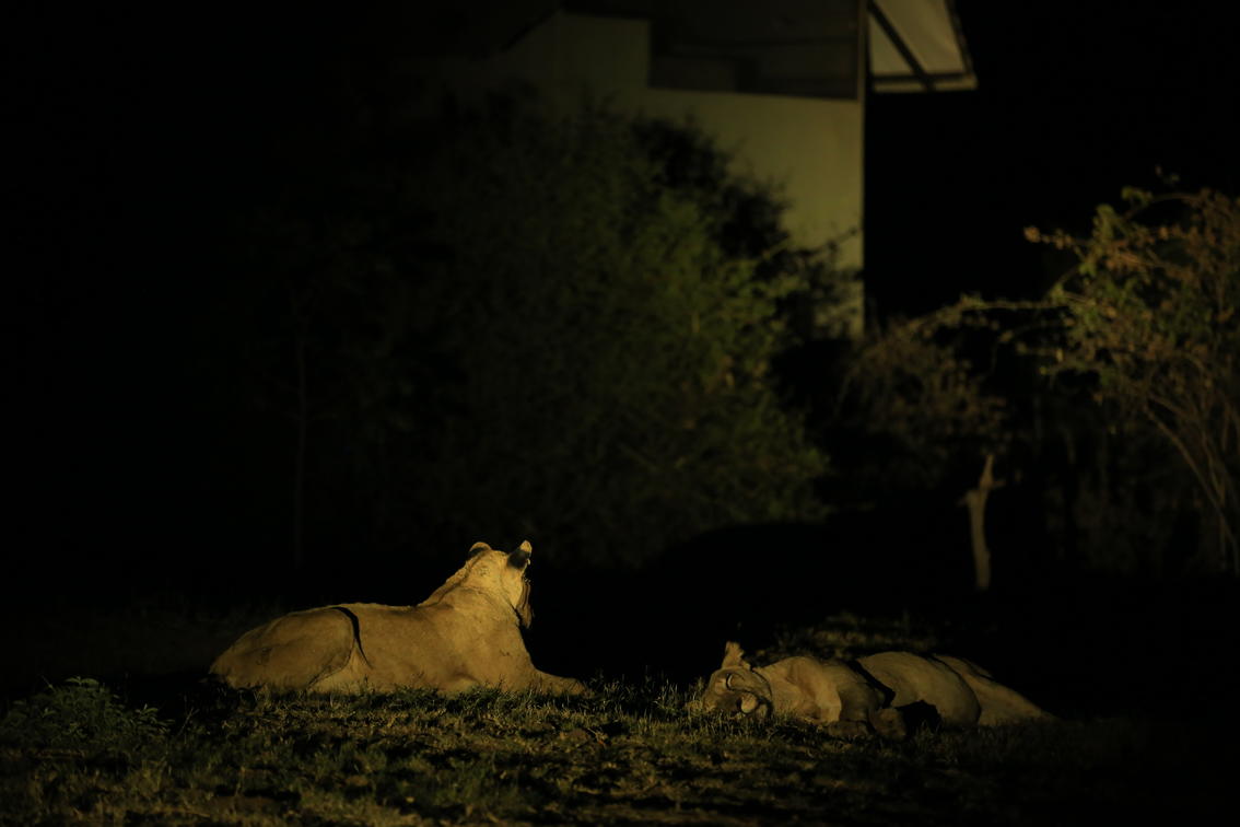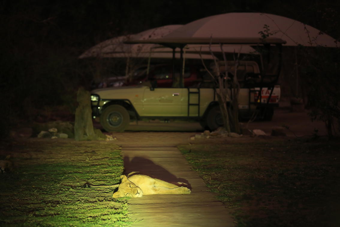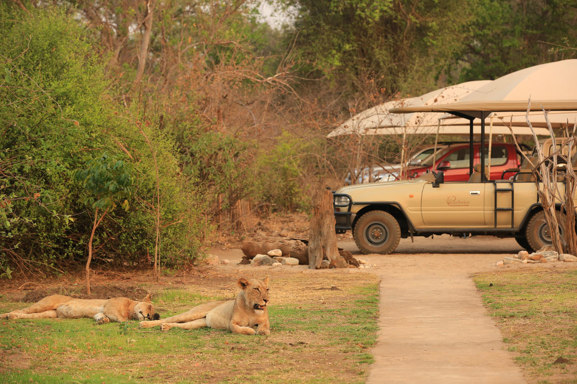 Zwei Löweninnen mit einem Nickerchen von einem der Zelte