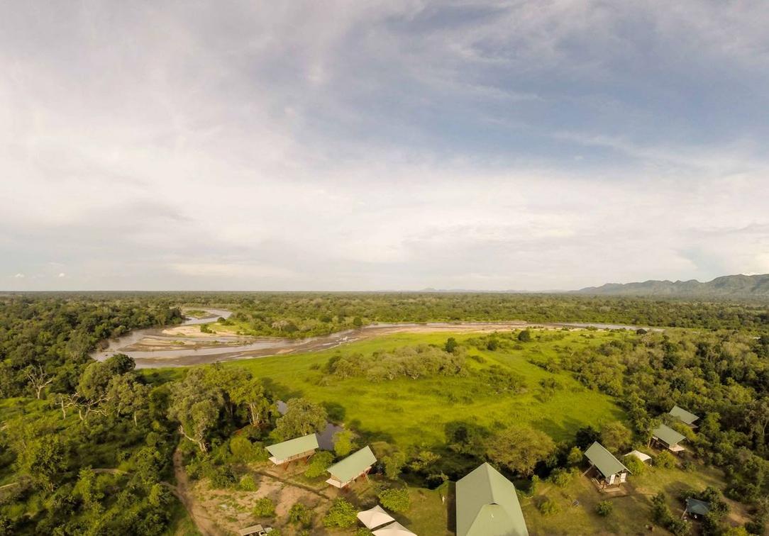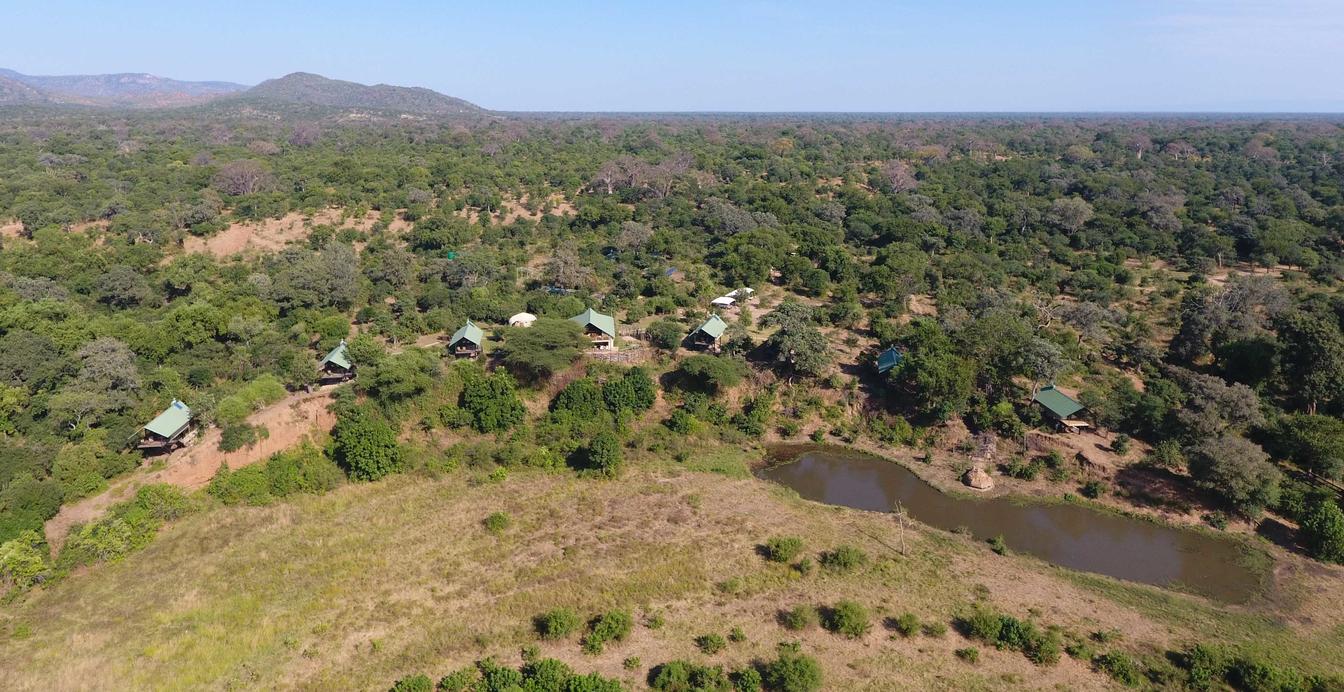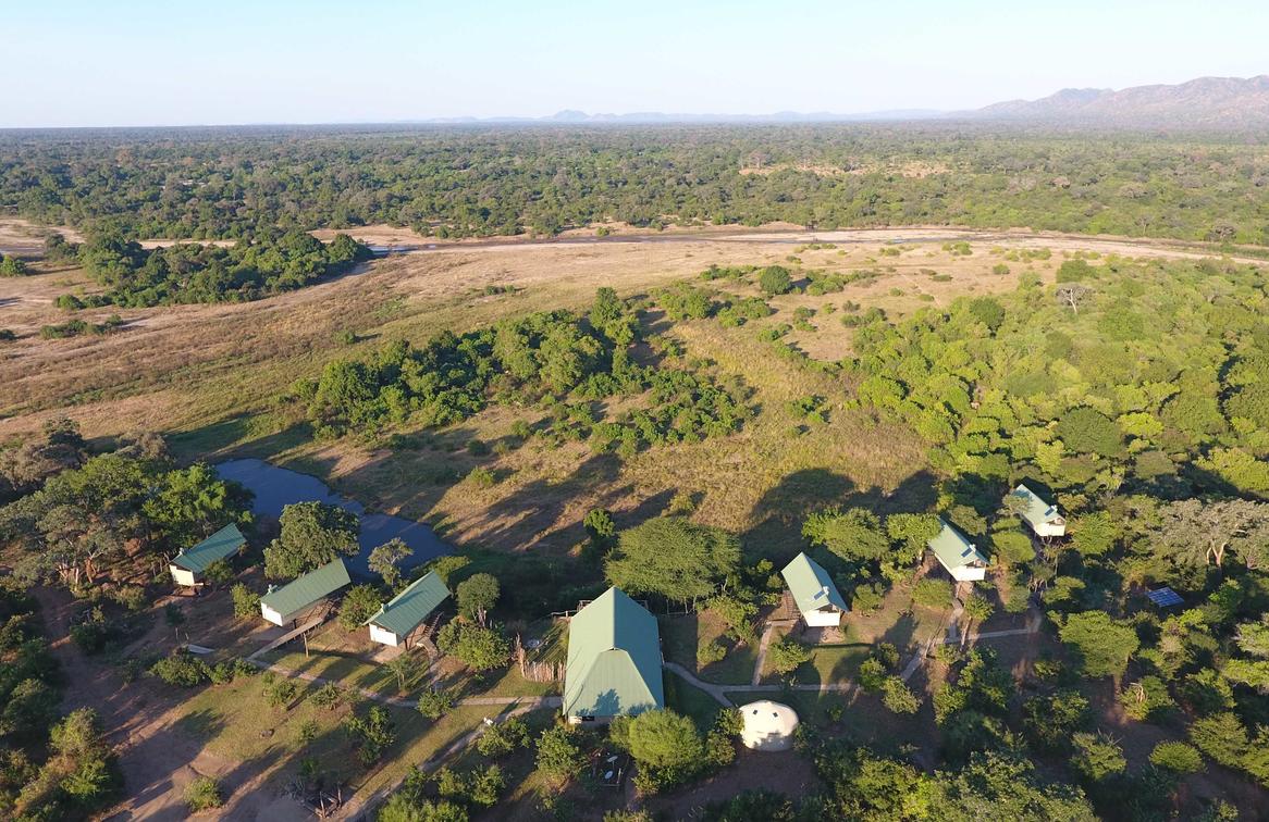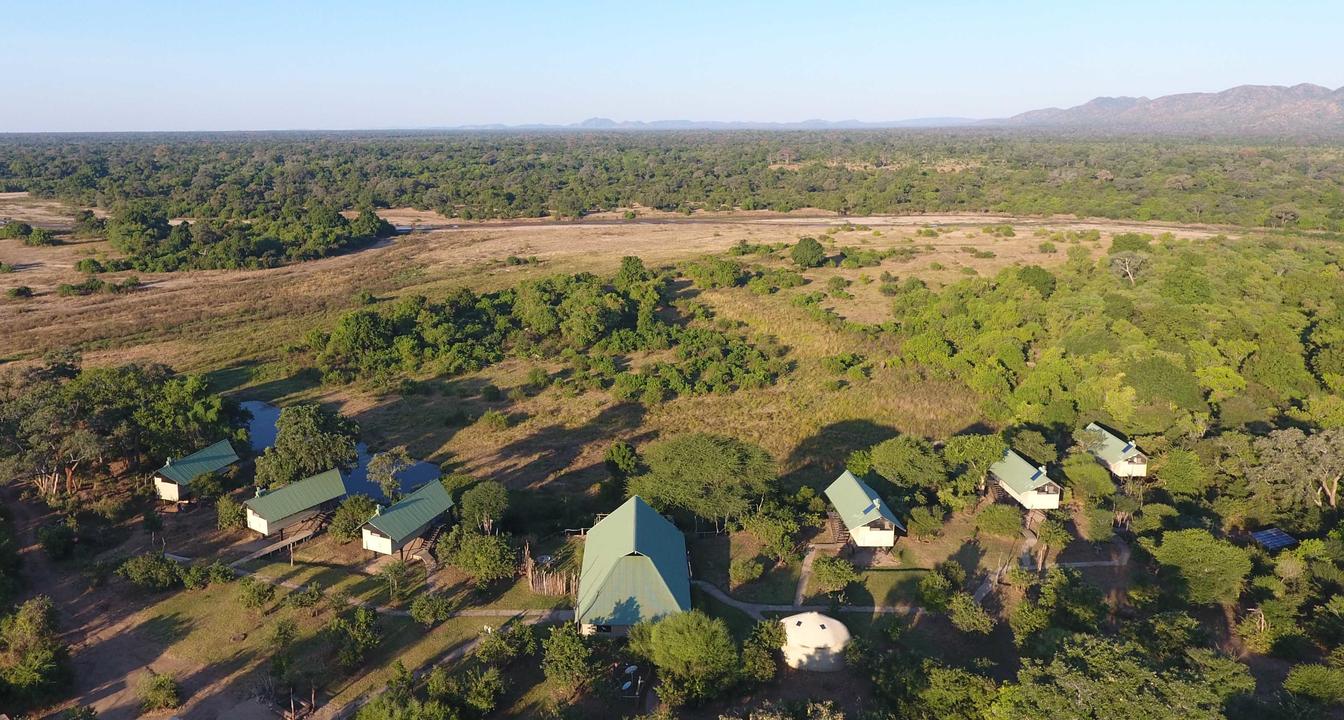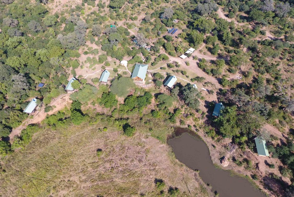 Luftaufnahme des Lagers mit Blick auf das Ruckomechi Riverbed
