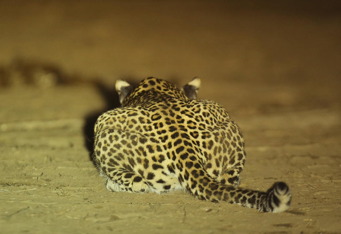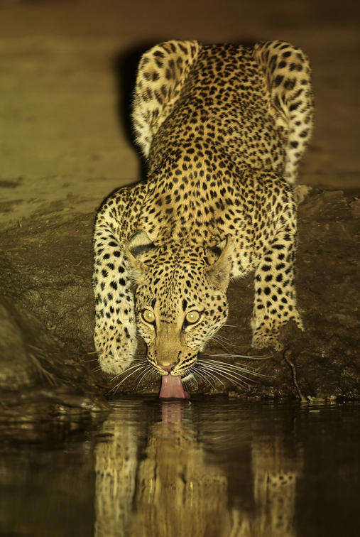 Ein schöner Leoparden-Trink aus der Pfanne in der Nacht