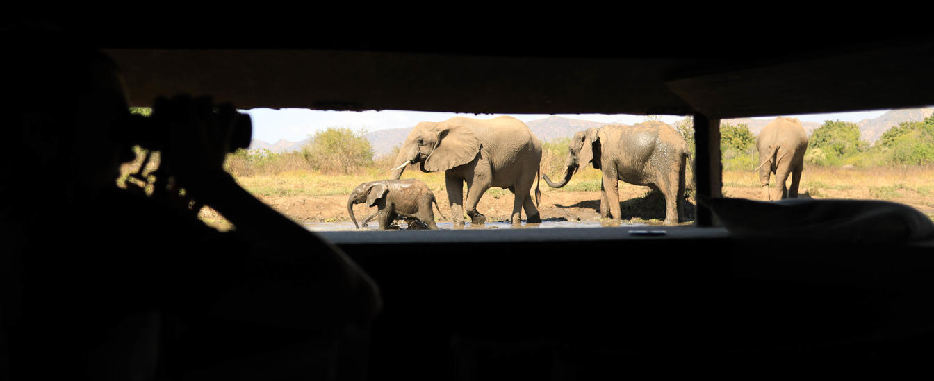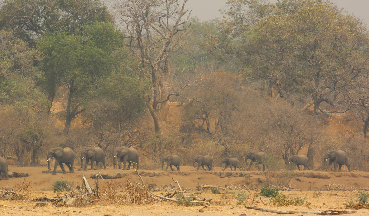Eine Elefantenfamilie auf dem Weg zu den Graben im Ruckomechi Riverbed