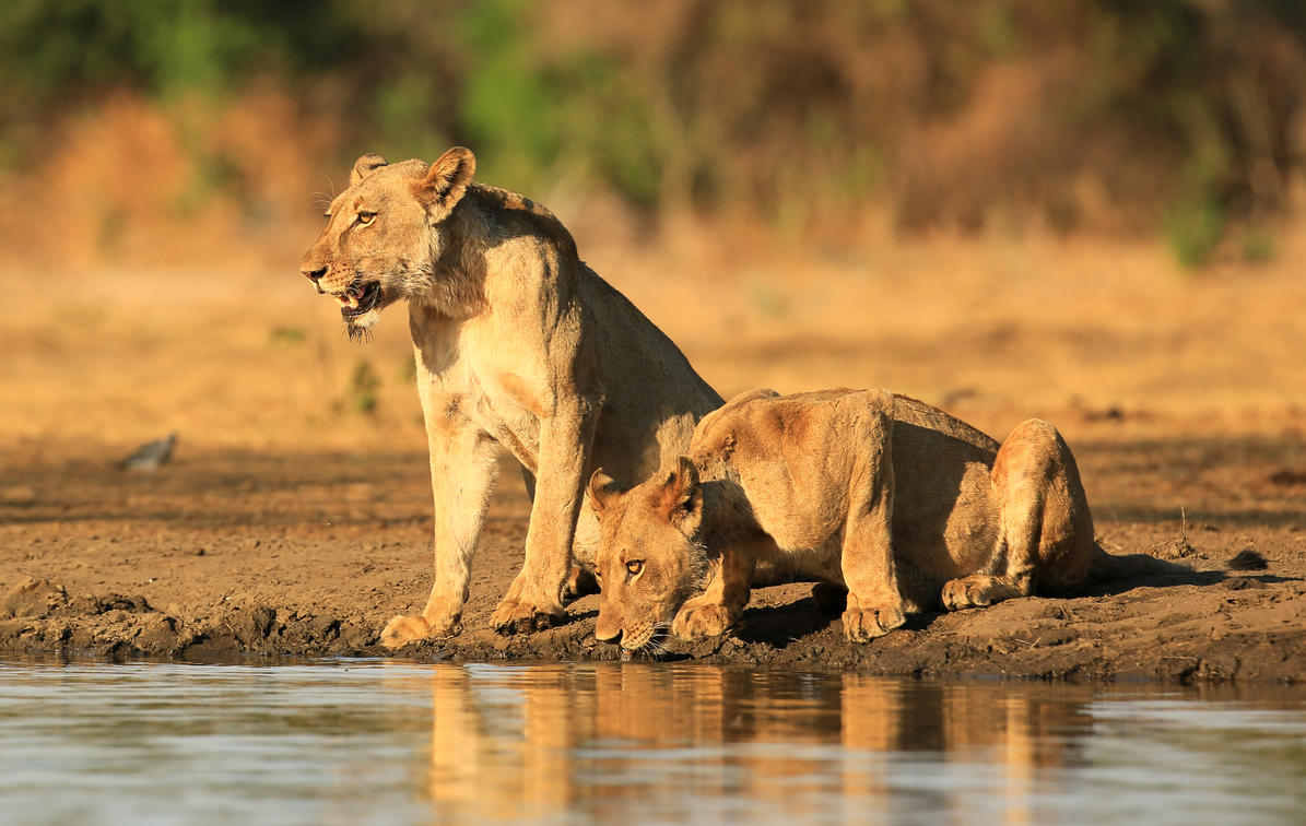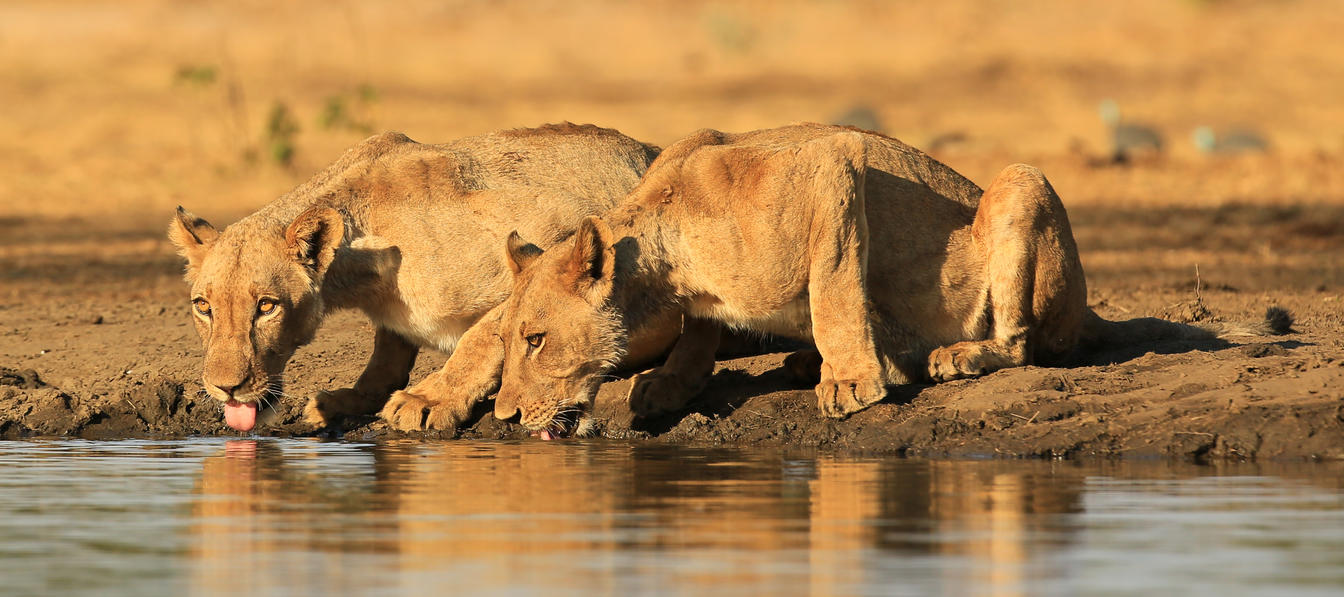 Eine Nahaufnahme von Löweninnen trinken in der Pfanne
