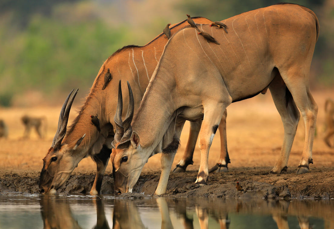 Eine Herde Büffel, die ihren Durst in der Pfanne stillen.