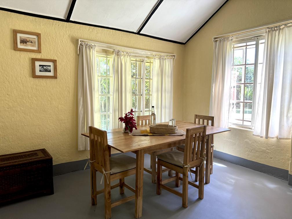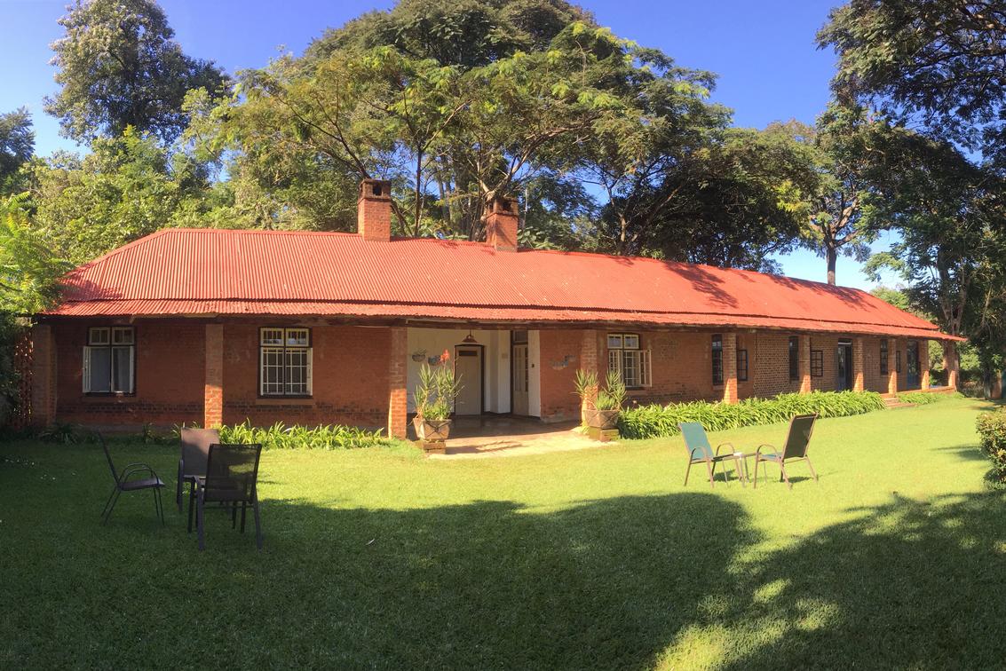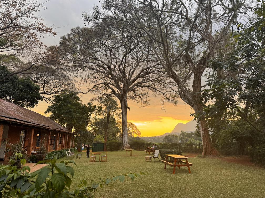 Restauranttisch im Garten, Blick auf den Mulanje-Berg