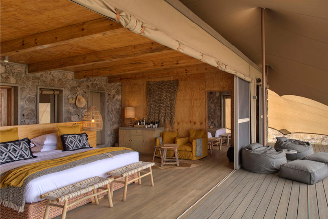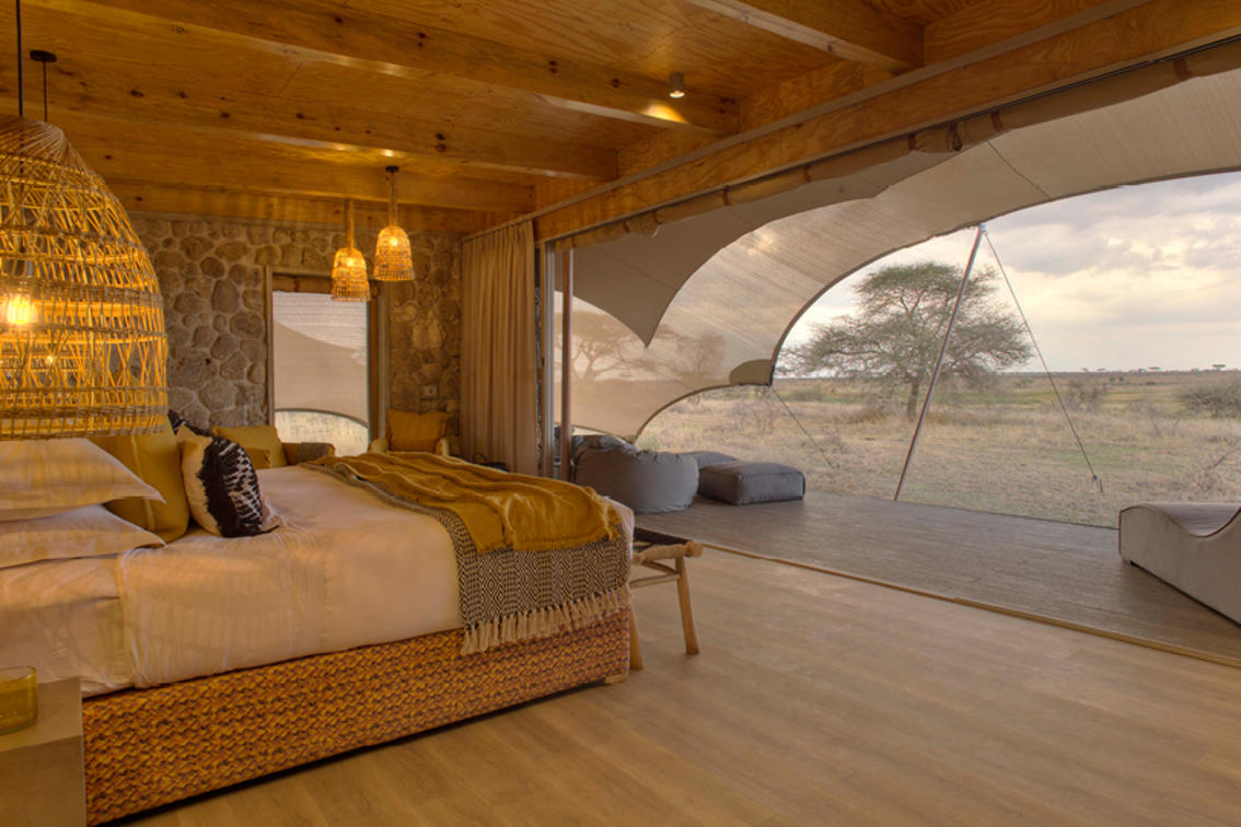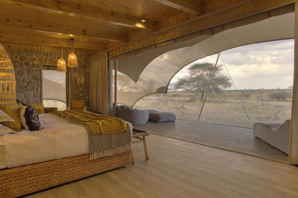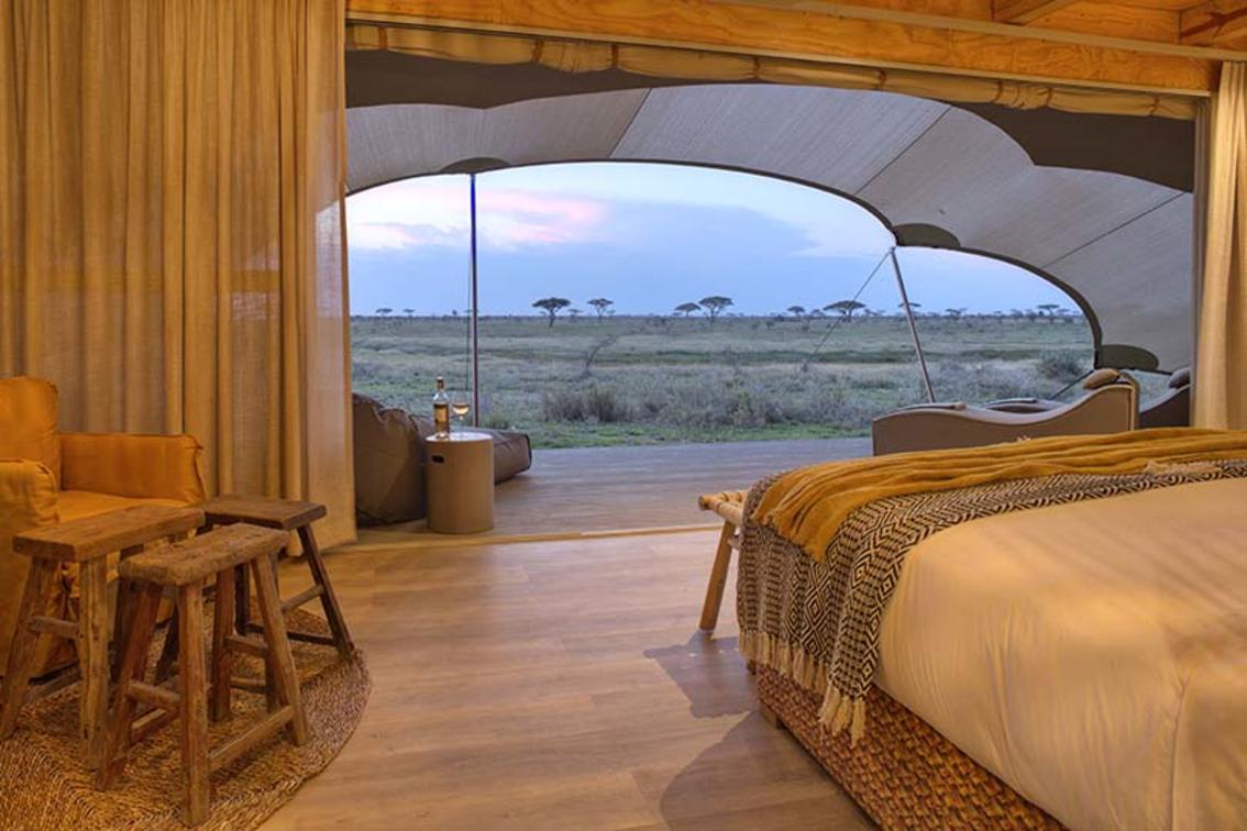 Namiri Plains — Zeltinnenraum mit Blick auf die Prärie