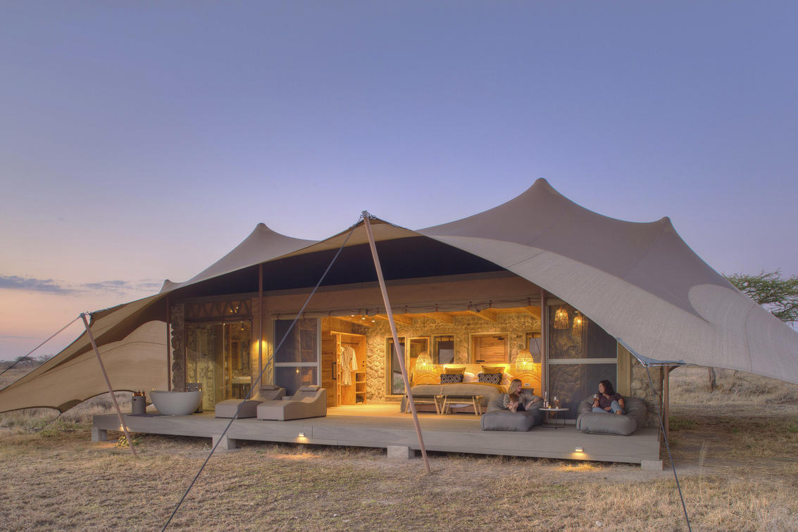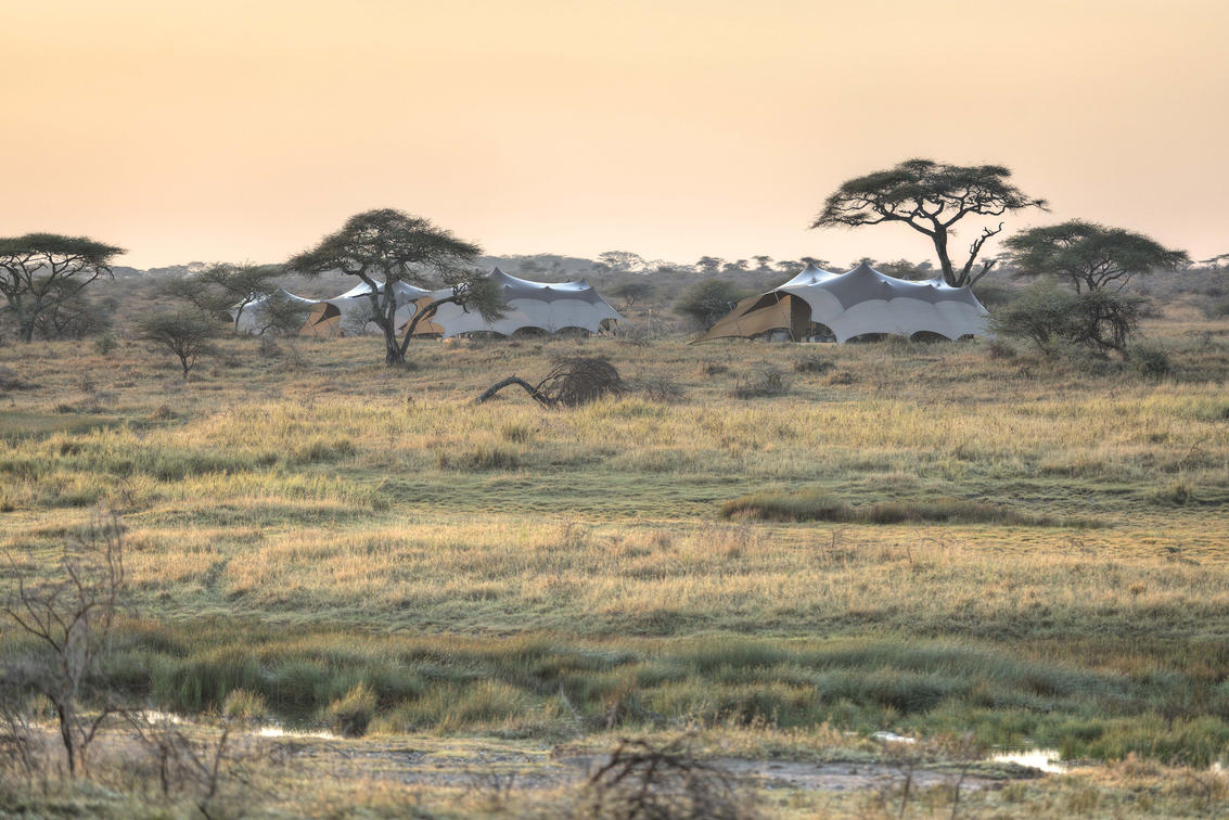 Namiri Plains — Außenansicht des Zeltes in der Morgendämmerung