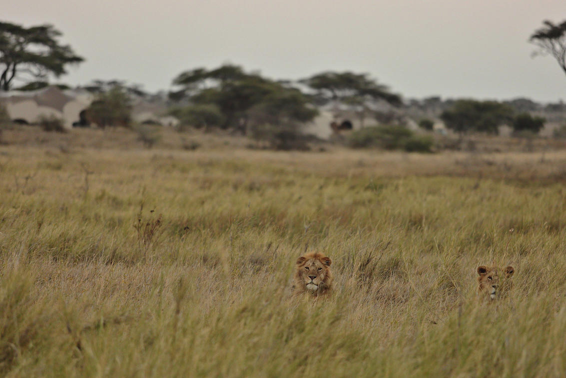 Namiri Plains - Löwen mit Zelten im Hintergrund