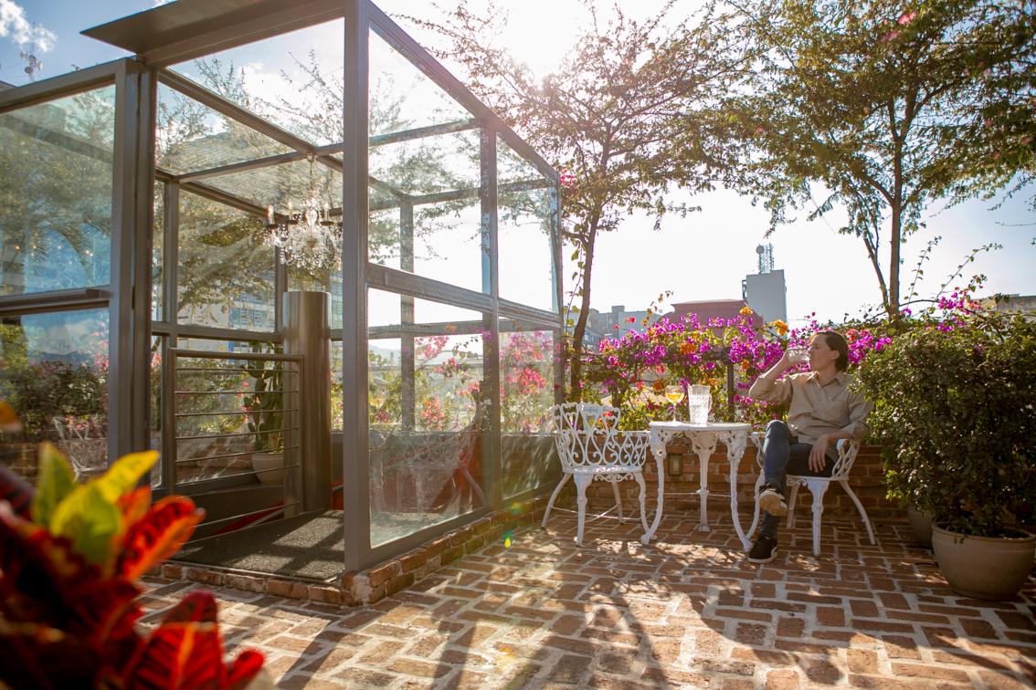 The rooftop of Hotel Presidente is home to Azotea Calle 7, a perfect shelter from the busy -and sometimes chaotic- heart of San José. You can enter through Calle 7, between Avenida Central and Avenida Segunda, either by taking the elevator or walking up two flights on the red spiral staircase that takes you right into the red-brick terrace, surrounded by colorful veraneras (bougainvilleas), palm trees, and a lime tree, whose fruits might end up in your cocktail.