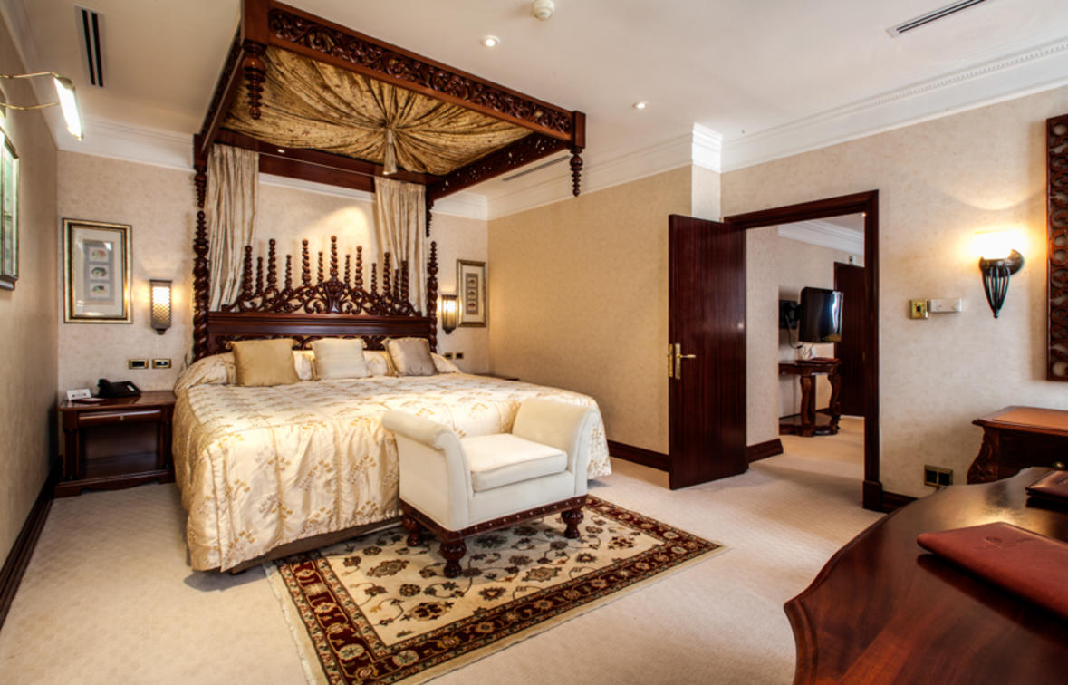 Situated in the centre of the building on the first floor, the impressive Presidential Suite offers magnificent views of the pool and the Indian Ocean. Featuring a dining room for up to eight people and an adjacent kitchenette, this elegant suite also offers a full bar, a guest toilet, a spacious lounge area and a private office. The bedroom has a dedicated dressing area and a stately four-poster bed. The balcony offers the capacity for a cocktail party for up to 50 persons. This suite also has a connecting door to a Deluxe Room to accommodate guests travelling with children, security or personal staff.