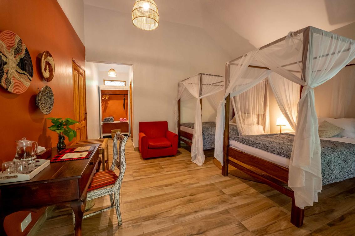 This room is a twin room containing two twin beds, each with a mosquito net, and an en-suite bathroom with shower only. An additional single bed (or infant cot) can be added to 6 of these rooms on request for children only.