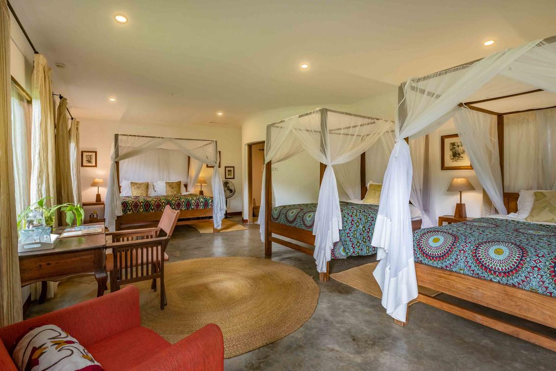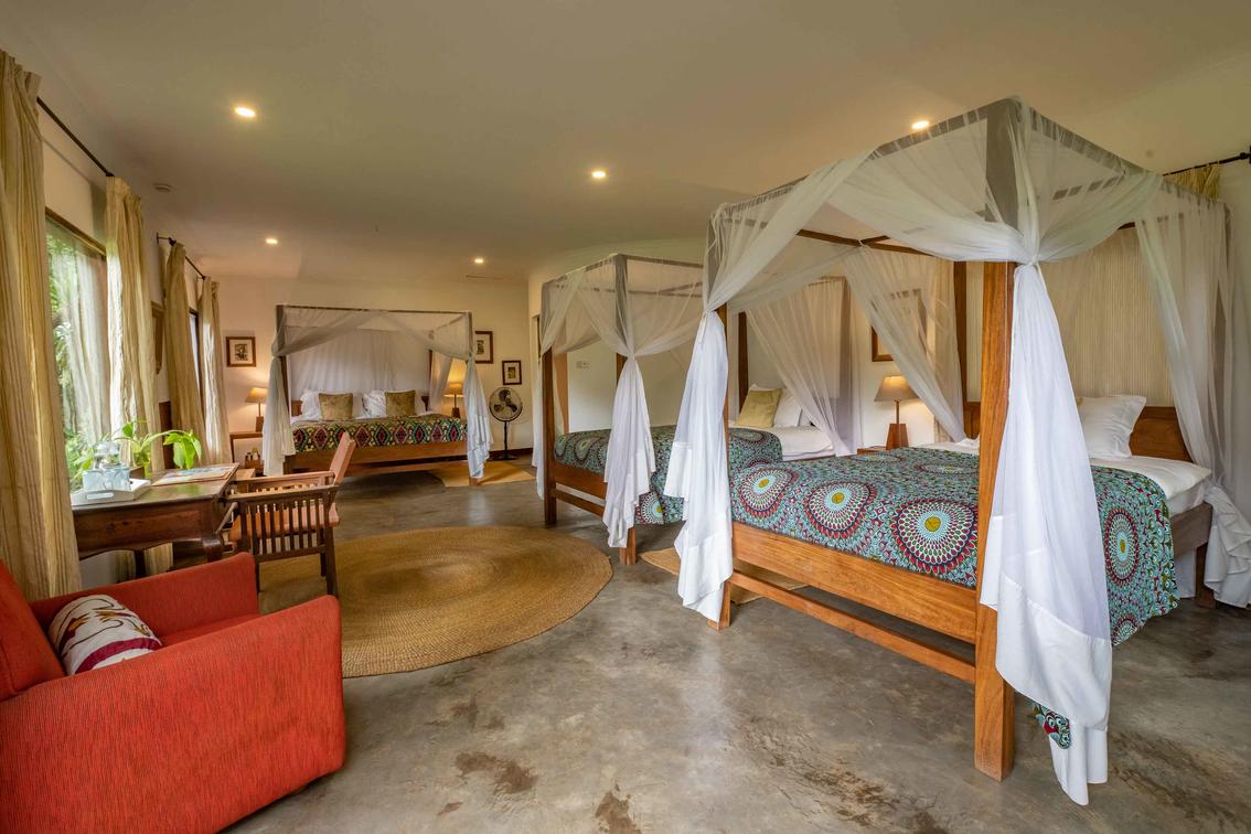 This is a family room with one double bed and two single beds, and a single bathroom with a shower only. There is Wi-Fi access in the room and mosquito nets on all the beds.