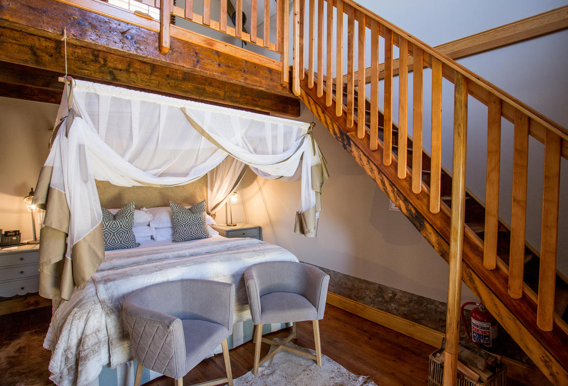 Standard Old Barn Room is on the upper floor (stairs) with limited views over the Village gardens from the balcony. En-suite bathroom with views over the valley, lounge area with fireplace, air-con, safe, mini bar and coffee & tea facilities.