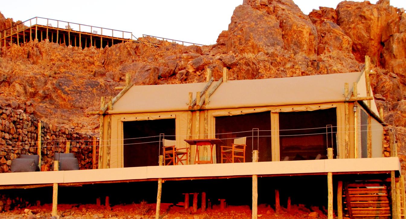 Custom build 85sqm Canvas Tents envelope guests in pure privacy, complete with an outside viewing deck, an indoor and outdoor shower, spacious bathroom and a Mini Bar provided by the Elegant Desert Lodge in the form of a cool box. Our Rock Pool on top of the mountain with a large sun downer deck offers the most exquisite views and scenery.