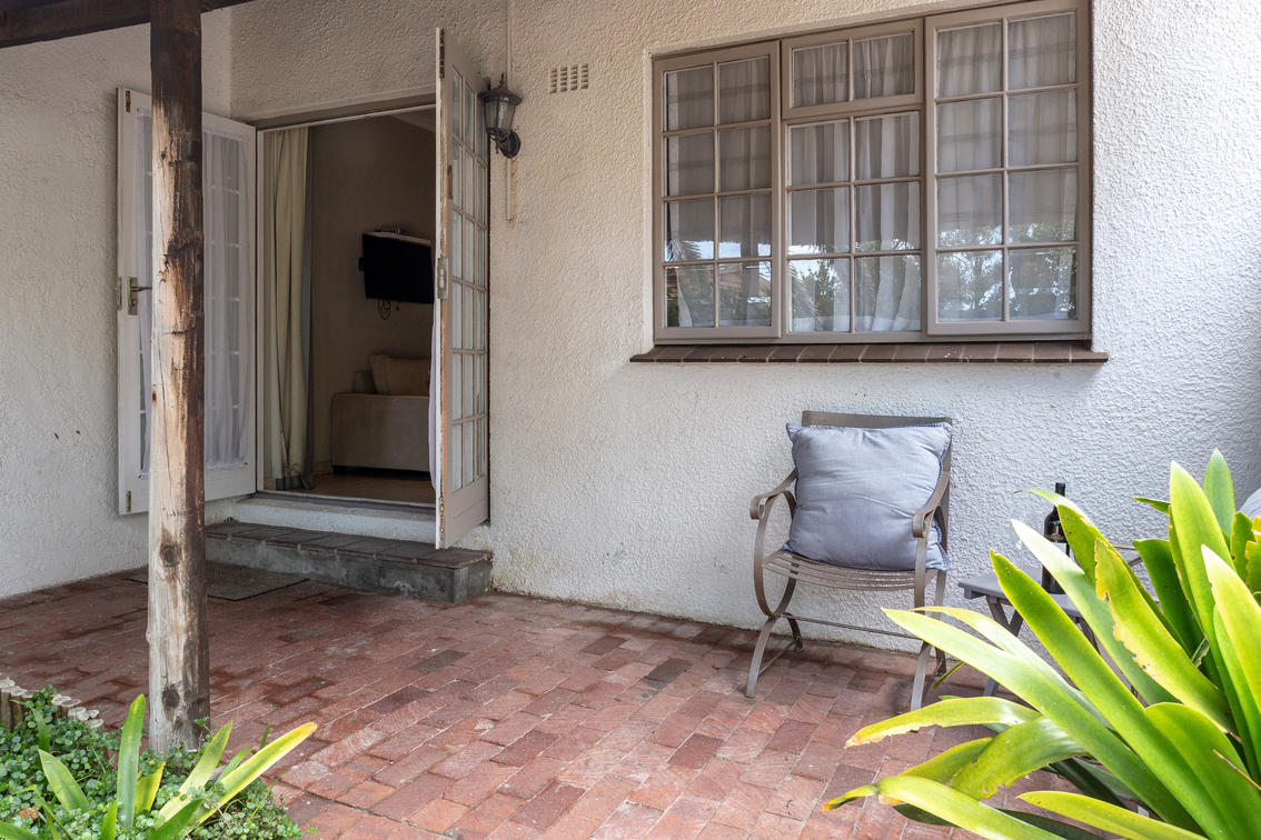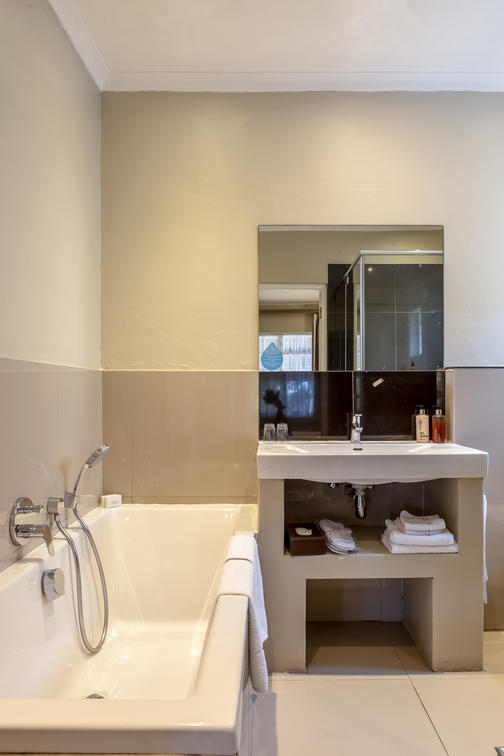 Elegantly decorated room with 2 x single beds which can be converted into a King Size bed with en-suite bathroom, consisting of bath and separate shower. Separate entrance onto patio and garden.