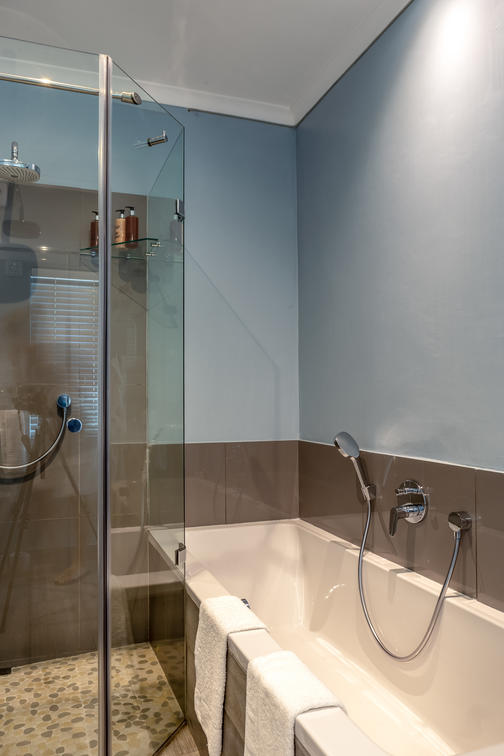 The new Villa offers two (2) contemporary decorated double Patio Deluxe Rooms (No.12 & 13) on the ground floor, with king size bed or twin beds. Each with their own en-suite bathroom, with bath and separate shower. Separate entrance with private patio. These 2 rooms can be combined as the Patio Deluxe Family Suite.