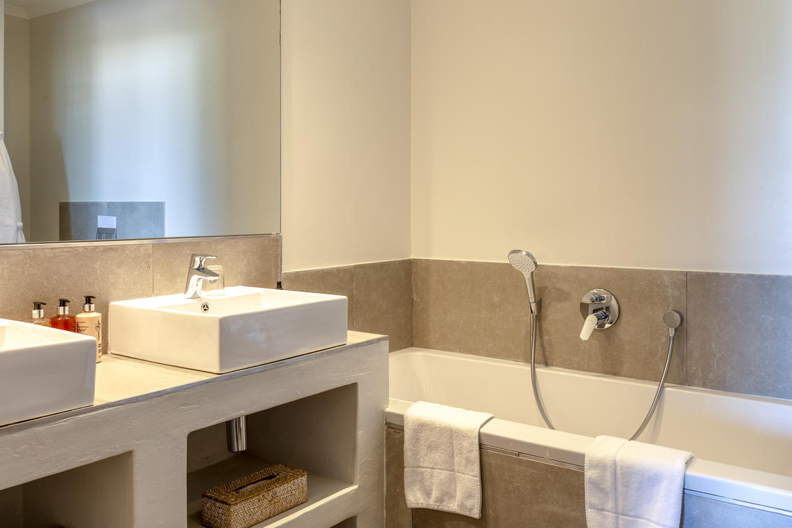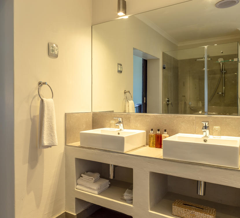 The Pool Suite @ the Villa has 2 floor levels, a private lounge on the ground floor overlooking the pool, on the 1st floor a double room with a King Size size and en-suite bathroom with shower (no bath) and a large balcony with beautiful views.